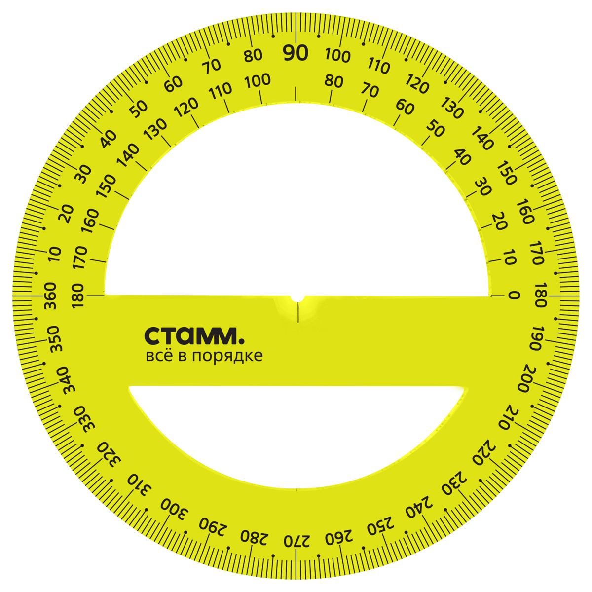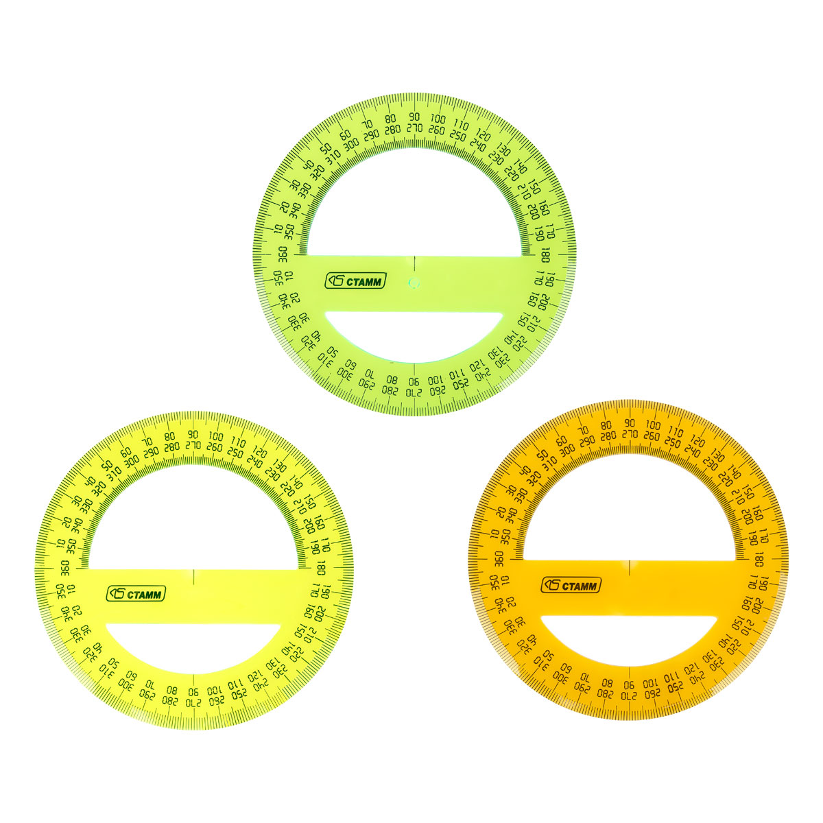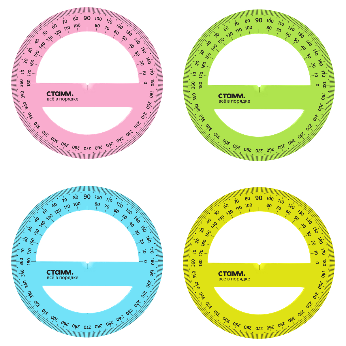 О товаре «Транспортир 12см, 360° СТАММ, пластиковый, прозрачный, неоновые цвета, ассорти»