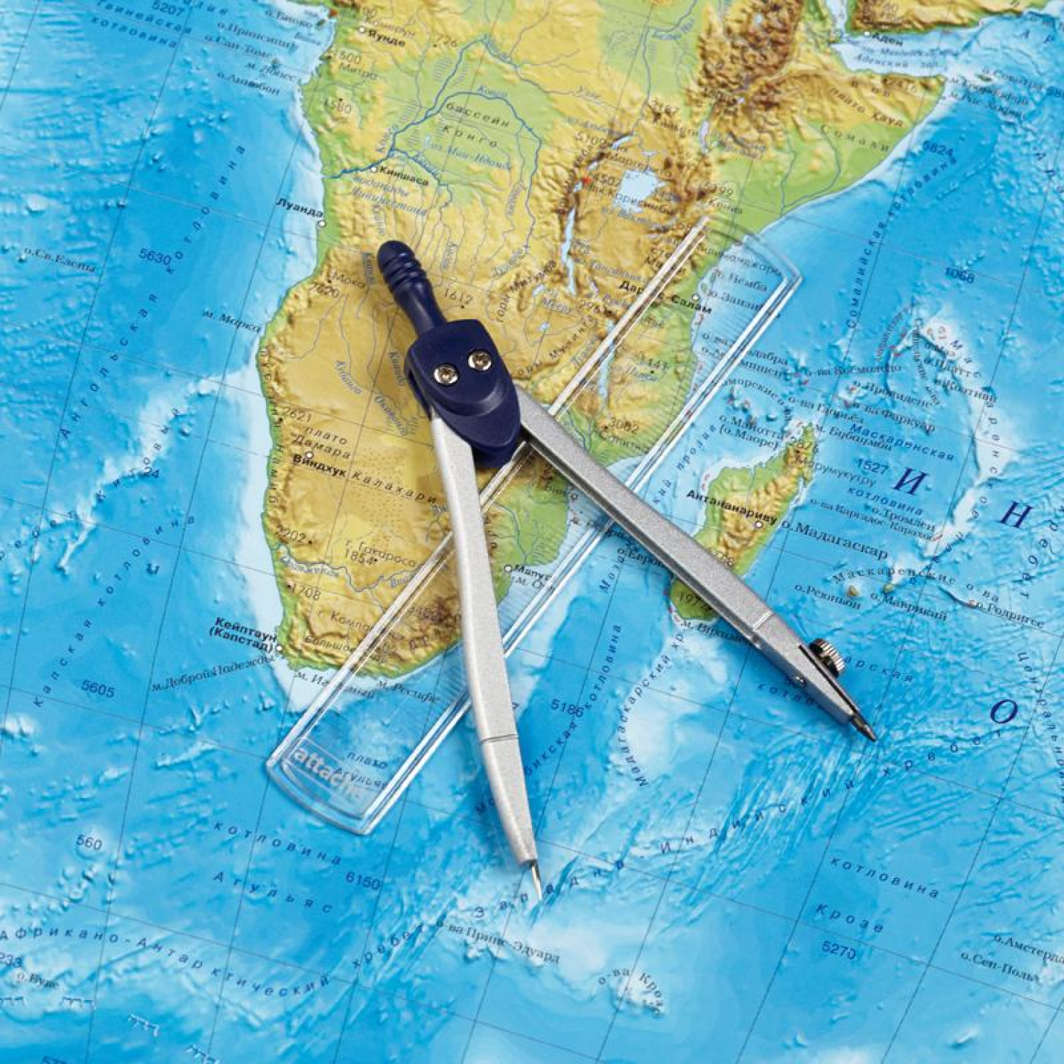 Циркуль из металлического сплава с линейкой в пенале. Длина — 115 мм.