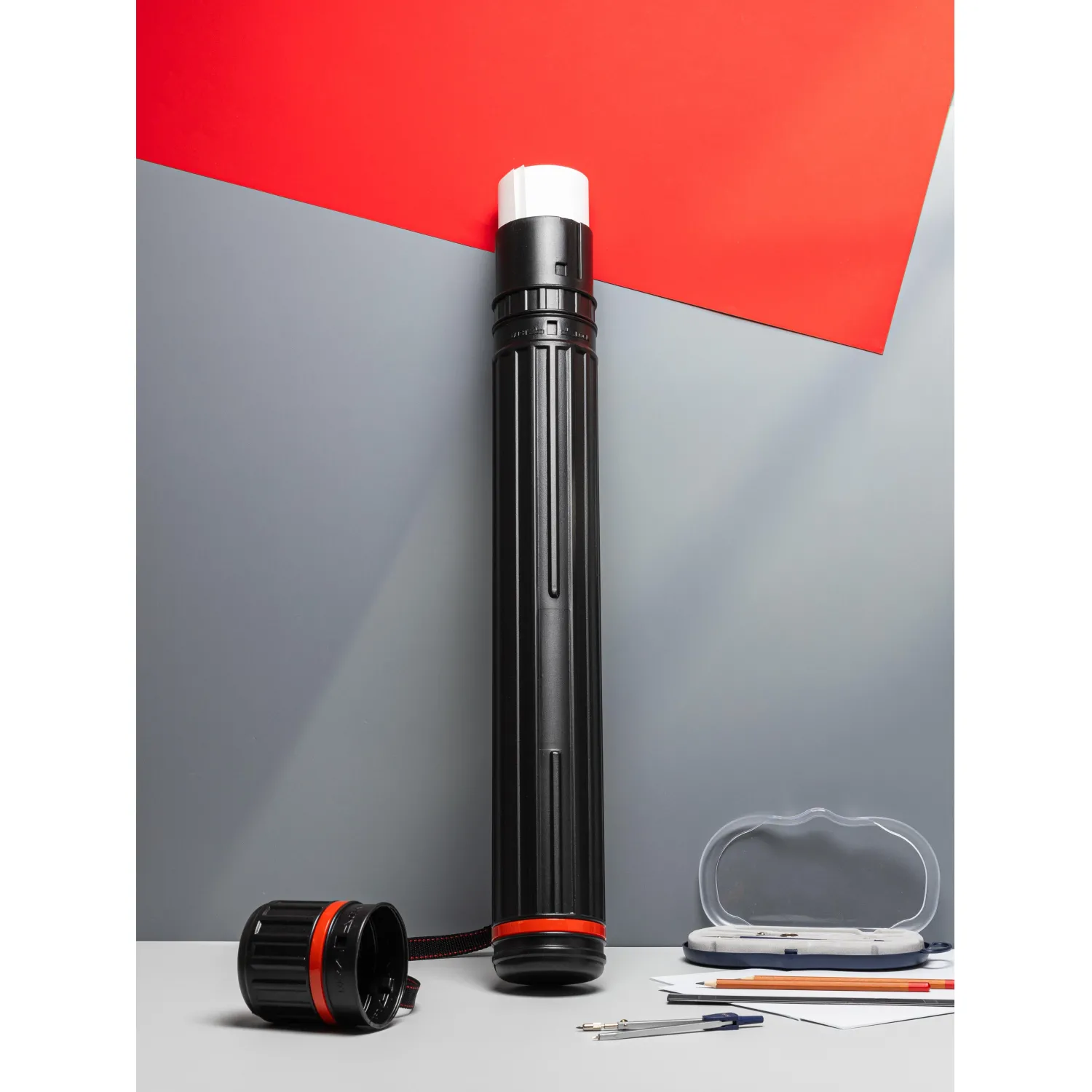 Тубус телескопический на ремне черного цвета. Длина 64 — 108 см, внешний диаметр 8 см. Предназначен для транспортировки и хранения чертежей, форматом А4 — А1, а также рисунков и рекламных плакатов.