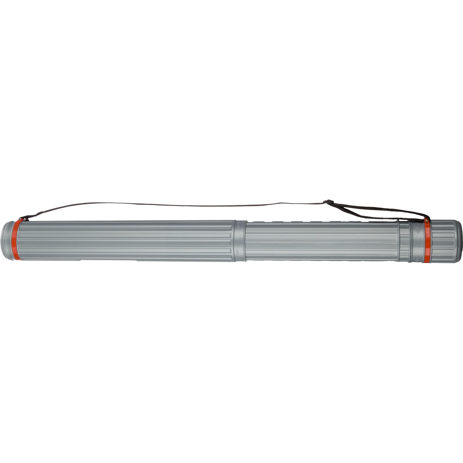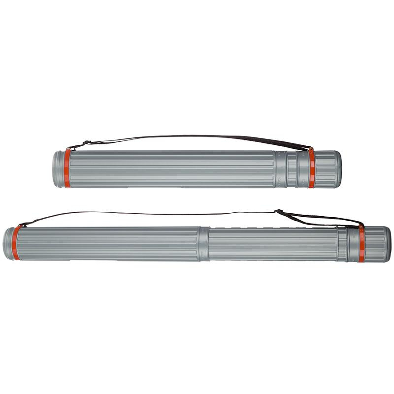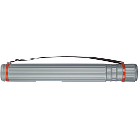 Тубус телескопический на ремне серого цвета. Длина 64–108 см, диаметр 8 см. Предназначен для транспортировки и хранения чертежей, форматом А4 — А1, а также рисунков и рекламных плакатов.