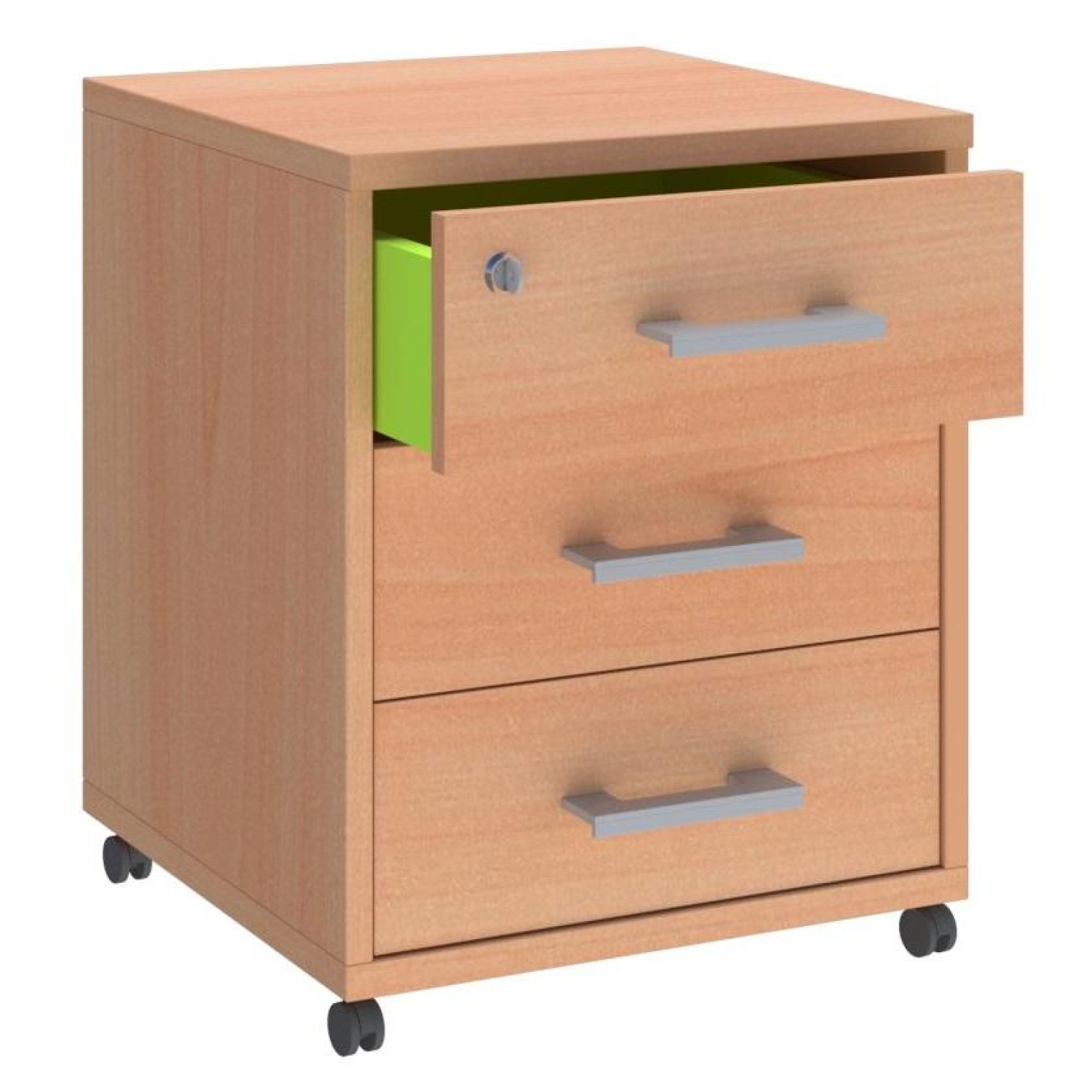 Выкатная тумба Арго имеет размеры 58×44 см и глубину 45 см. Изготовлена из деревоплиты (ДСП) с износостойким ламинированным покрытием цвета бук. Оснащена тремя выдвижными ящиками, верхний из которых закрывается на ключ. Кромки отделаны лентой из ПВХ для защиты от повреждений. Основание тумбы с четырьмя роликами для удобного перемещения. Боковая и задняя стенка выдвижного ящика выполнена в цвете лайм.