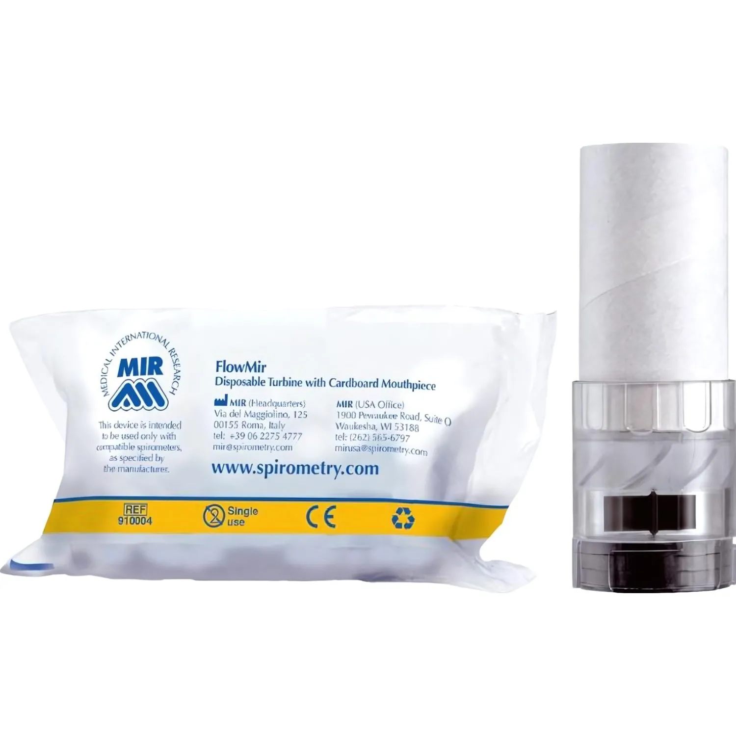 Турбина включает в себя картонный мундштук и проходит индивидуальную заводскую калибровку с помощью компьютеризированной системы. FlowMIR является недорогой альтернативой дорогостоящим турбинам многократного применения и не требует применения антибактериальных фильтров. С помощью турбины можно провести группу тестов спирометрии на одном пациенте, включая бронхопровокационный и бронхолитический тесты. После проведения спирометрического тестирования использованные турбина и мундштук выбрасываются ХАРАКТЕРИСТИКИ: Стандарты — ATS, ERS Диапазон измерения — 16