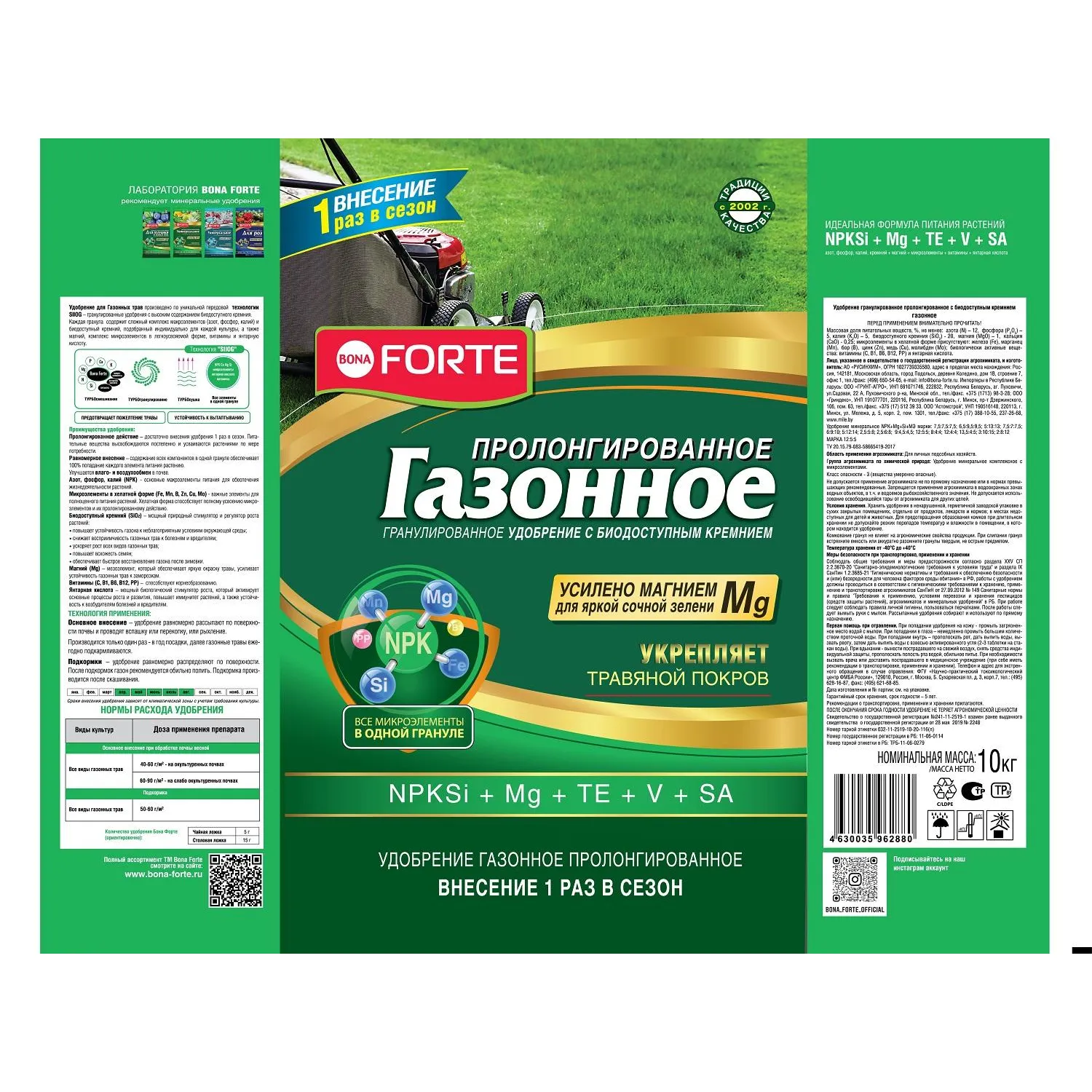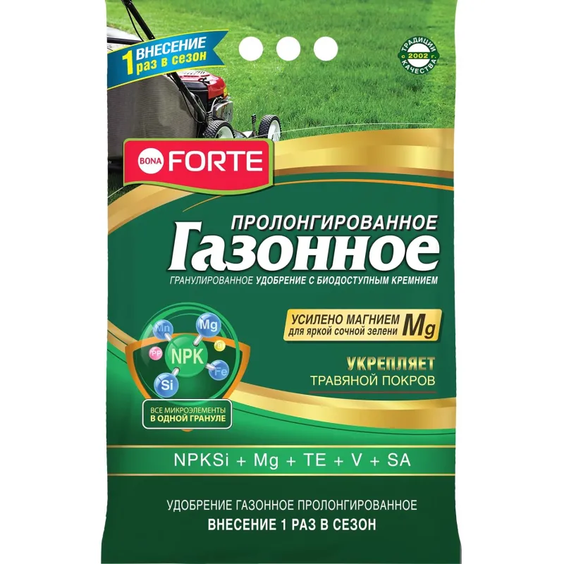 Произведено по уникальной передовой технологии «Shog», обеспечивающей важные качественные преимущества перед традиционным смешением: Равномерное внесение — благодаря содержанию всех компонентов в одной грануле растение гарантированно обеспечивается каждым элементом питания. Пролонгированное действие — благодаря входящему в состав удобрения цеолиту удобрение не вымывается со временем (одного внесения хватает на весь сезон). Хорошая растворимость — удобрение начинает действовать моментально. Экономичное расходование — благодаря гранулам можно с высокой точностью вносить удобрение и подкармливать растения. Удобрение содержит основные элементы питания в легкоусвояемой форме и сбалансированном соотношении, способствует хорошему росту растений. Состав: Три основных макроэлемента (NPK): азот (N) — 12 %, фосфор (P2O5) — 5 %, калий (K2O) — 5 % Si: биодоступный кремний — 20%. Мезоэлементы: магний — 1 %, кальций — 0,25 %. Микроэлементы: бор, железо, марганец, цинк, медь, молибден. Микроэлементы находятся в хелатной (легкоусваиваемой) форме. Комплекс витаминов: B1, B6, B12, PP, С. Стимулятор роста: янтарная. кислота. Расход одного пакета: — при основном внесении: до 250 м . — при подкормке: до 200 м . Дополнительная информация: После окончания срока годности удобрение не теряет агрономической ценности. Мера веса удобрения Bona Forte Газонное (ориентировочно): чайная ложка — 5 г, столовая ложка — 15 г.