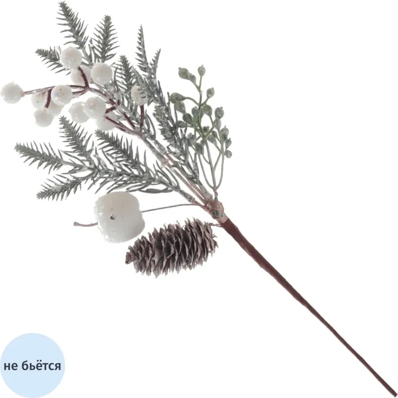 Новогоднее украшение на ёлку выполнено в зелёном цвете и украшено шишкой, яблоком и ягодами, что создаёт атмосферу зимнего леса. Дополнительный декор с эффектом инея и блёстками придаёт ветке праздничное сияние и делает её ещё более выразительной. Ветка изготовлена из полимера и металла, что придаёт ей прочность и долговечность. Размер изделия составляет 10×10×38 см, высота — 38 см. В упаковке содержится одно украшение, поставляется без индивидуальной упаковки. Ветка подходит для украшения высотных ёлок и может быть использована как самостоятельный элемент или как часть новогодних композиций.