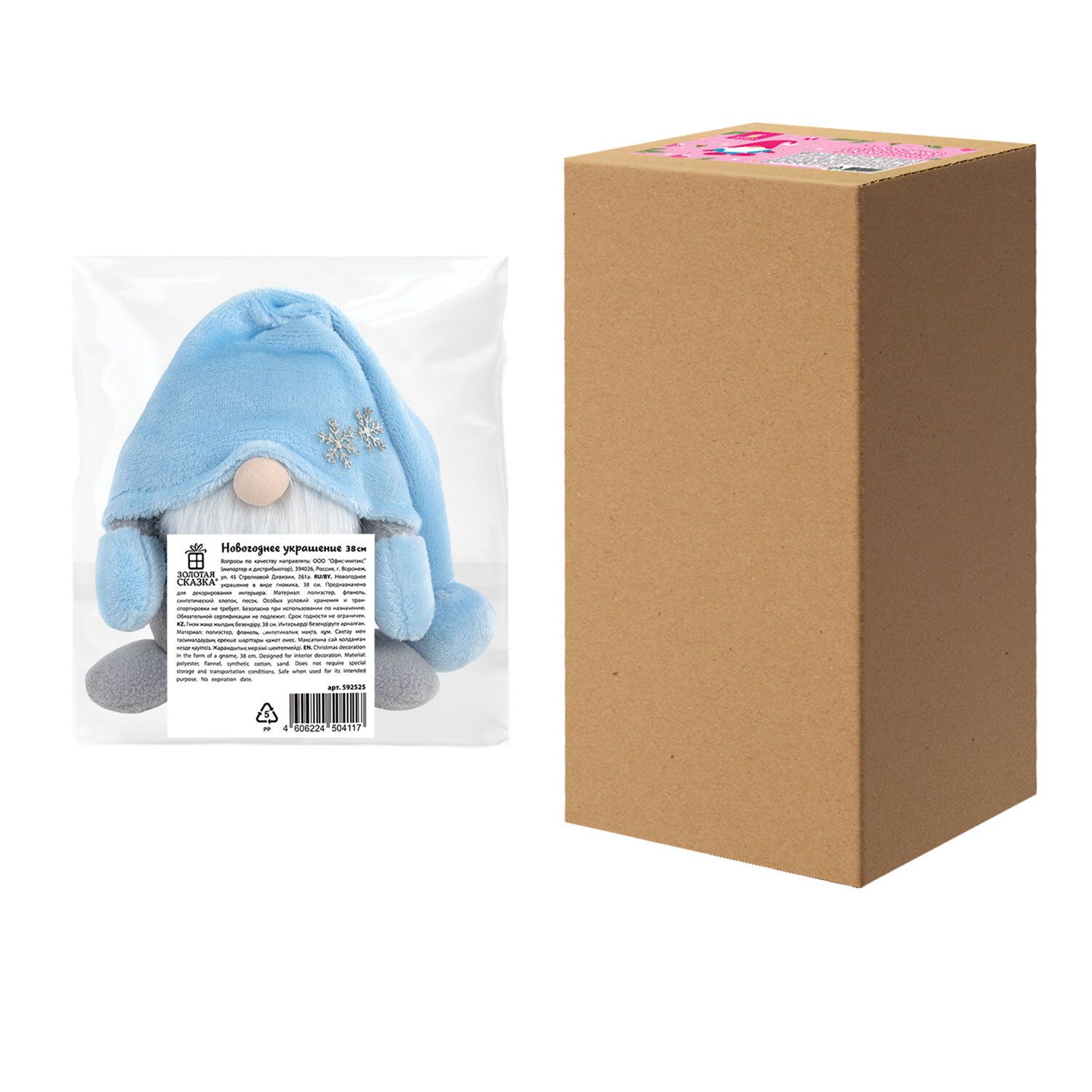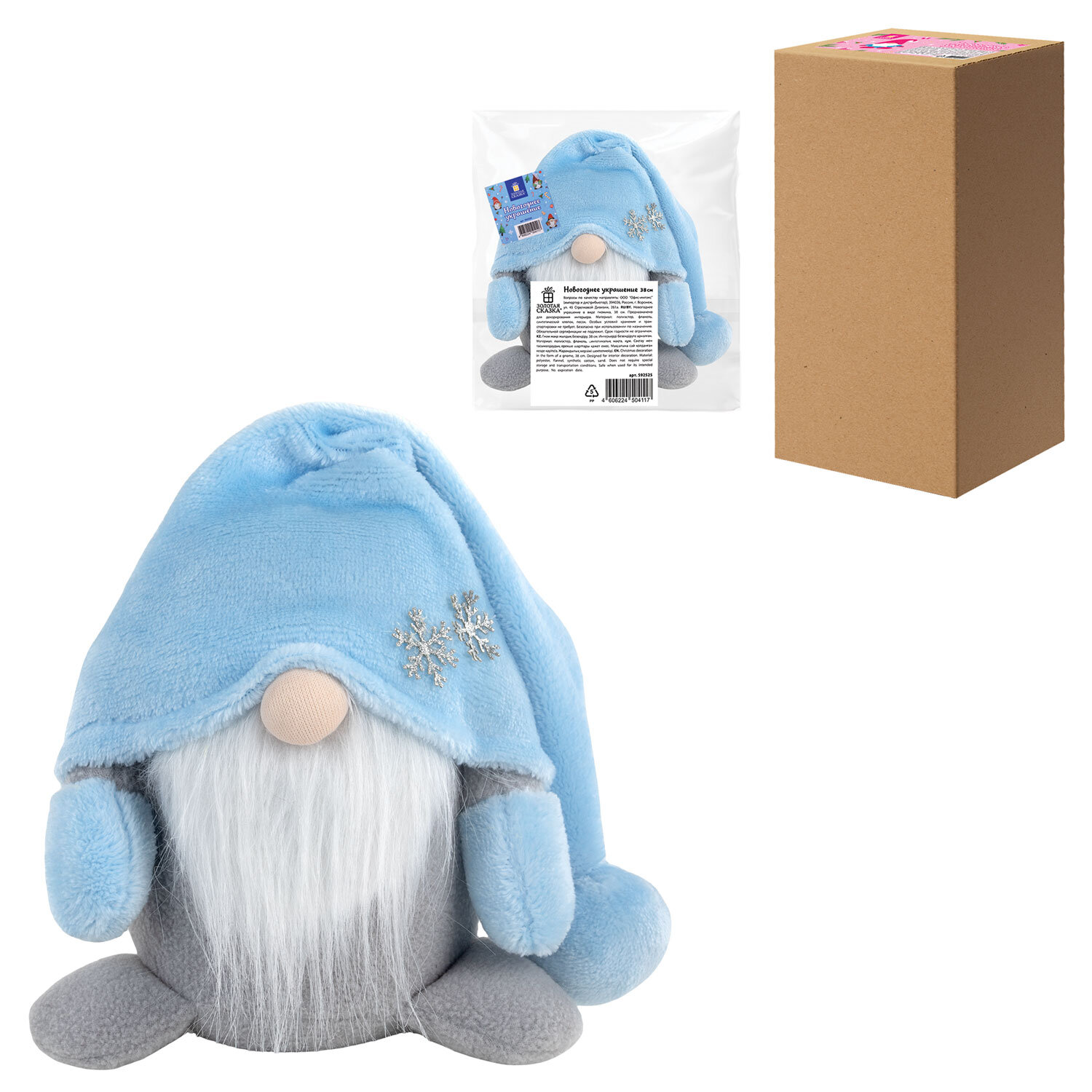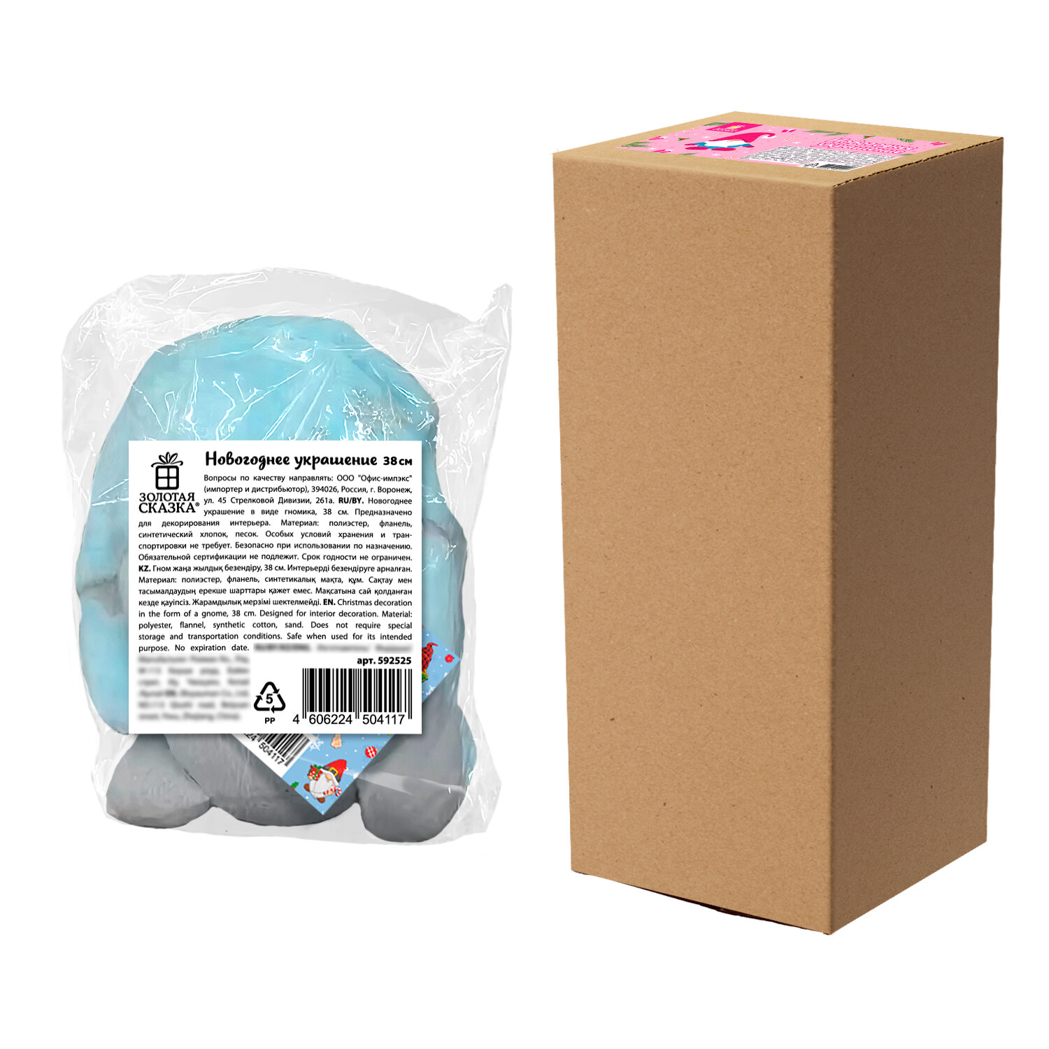 Украшение упаковано в пакет с клейким краем, а затем в прочный гофрокороб. Материал – полиэстер. Длина – 17 см, размер с вытянутой шапочкой – 38 см.