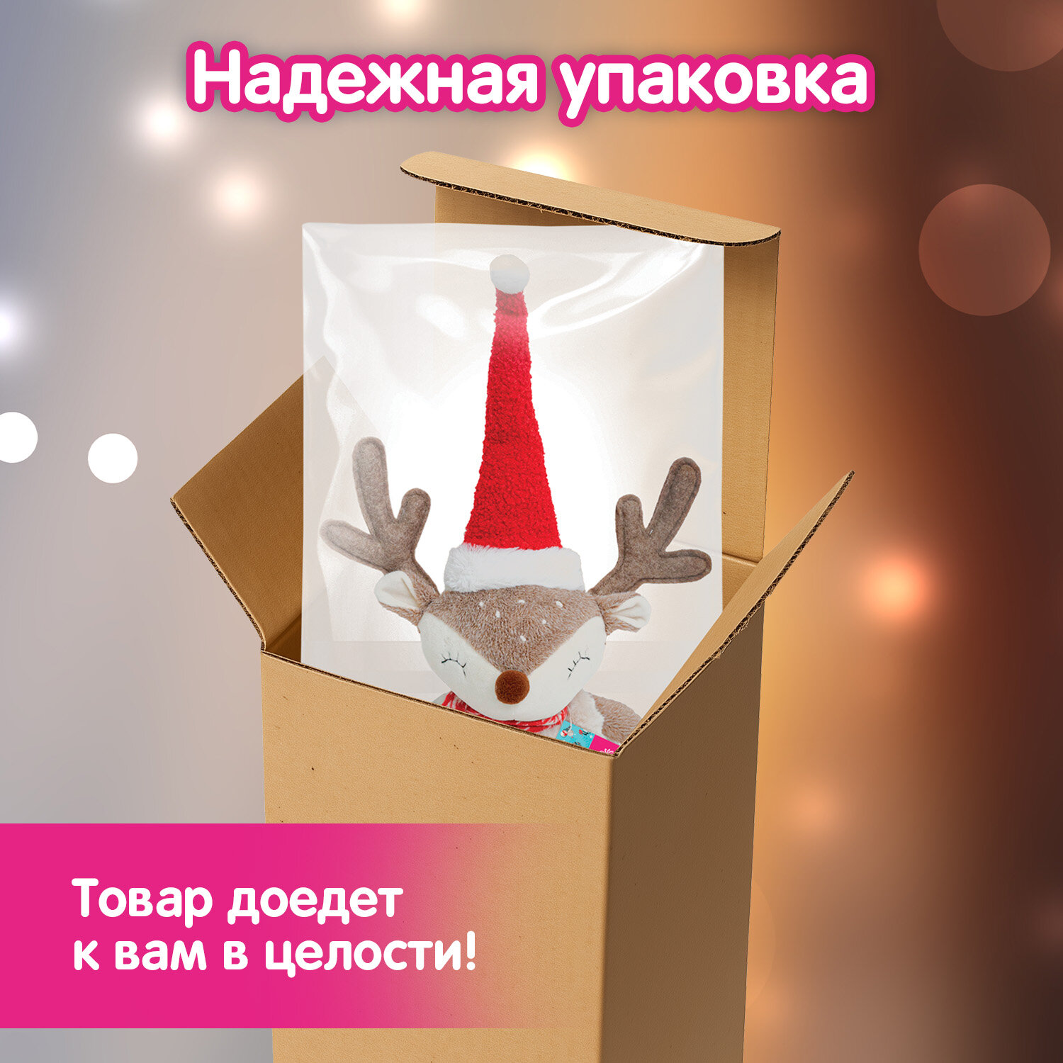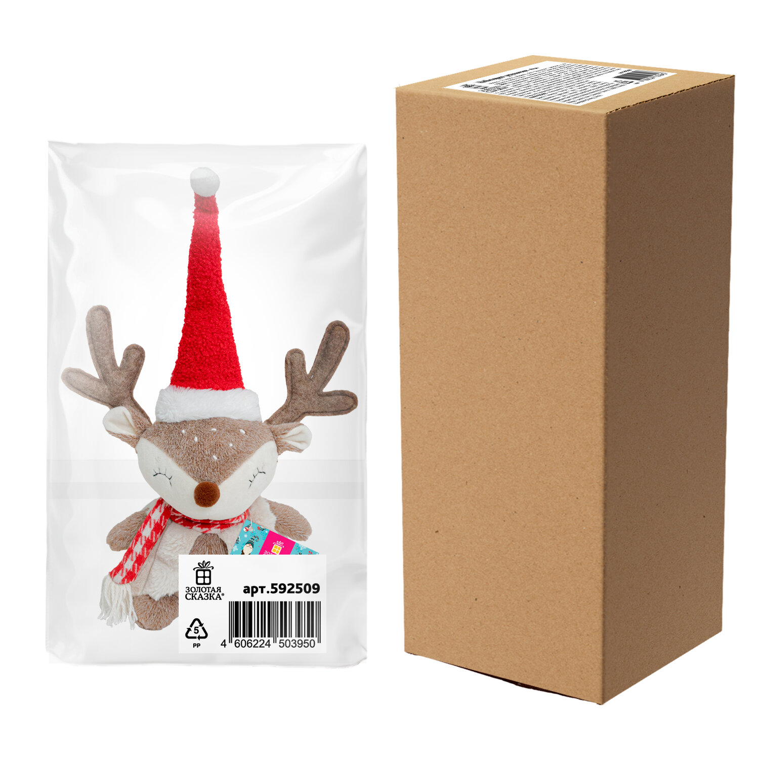 Олененок упакован в пакет с клейким краем и в гофрокороб. Материал – полиэстер, дерево. Размер – 40 см.