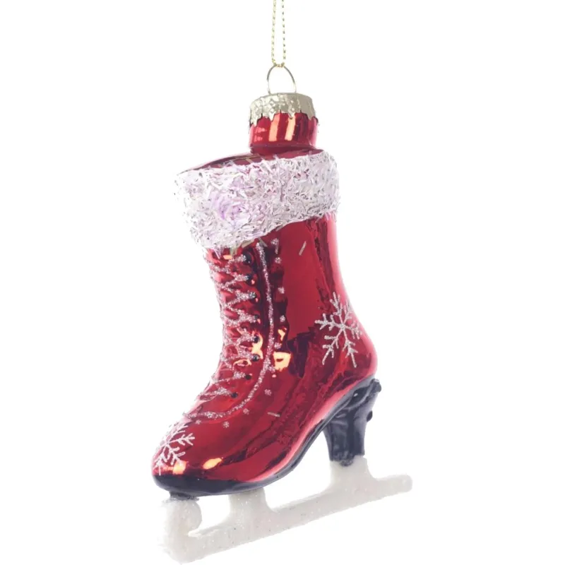 Новогоднее украшение на ёлку выполнено из стекла и украшено росписью. Красно-белая цветовая гамма дополнена блёстками, создающими эффект сверкающего снега и придающими изделию праздничное сияние.
