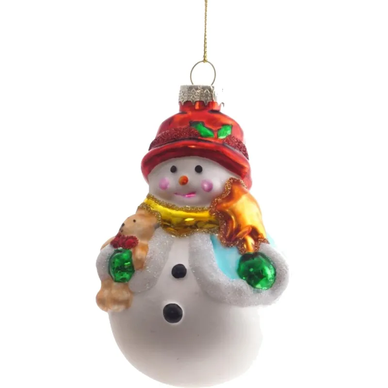 Игрушка снабжена подвесом для удобного размещения на ветвях ёлки. Стеклянная текстура придаёт изделию утончённость, а жизнерадостное выражение лица снеговика создаёт атмосферу веселья и уюта.