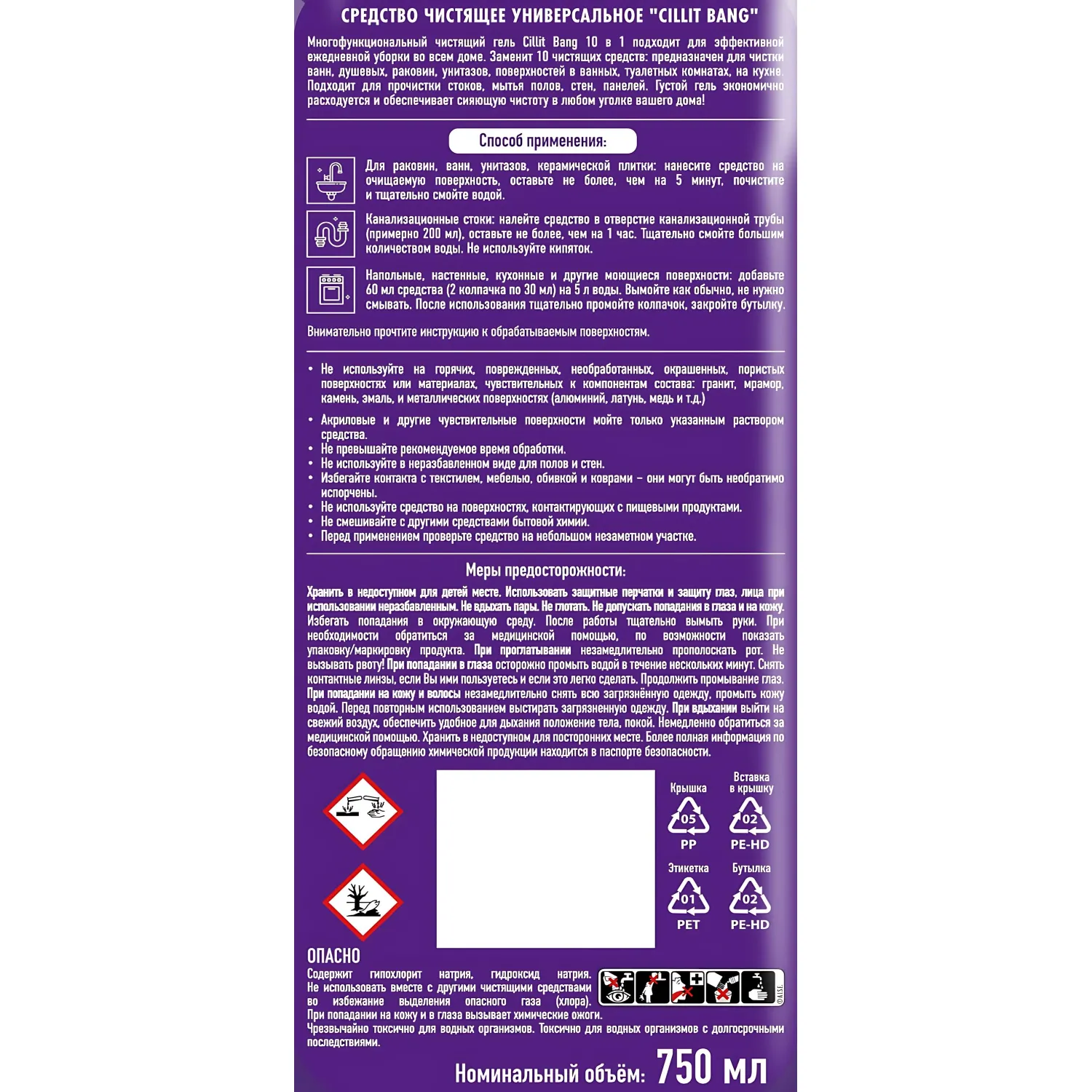 ОПАСНО! Содержит гипохлорит натрия, гидроксид натрия. Не использовать вместе с другими чистящими средствами во избежание выделения опасного газа (хлора). При попадании на кожу и в глаза вызывает химические ожоги. Чрезвычайно токсично для водных организмов с долгосрочными последствиями.
