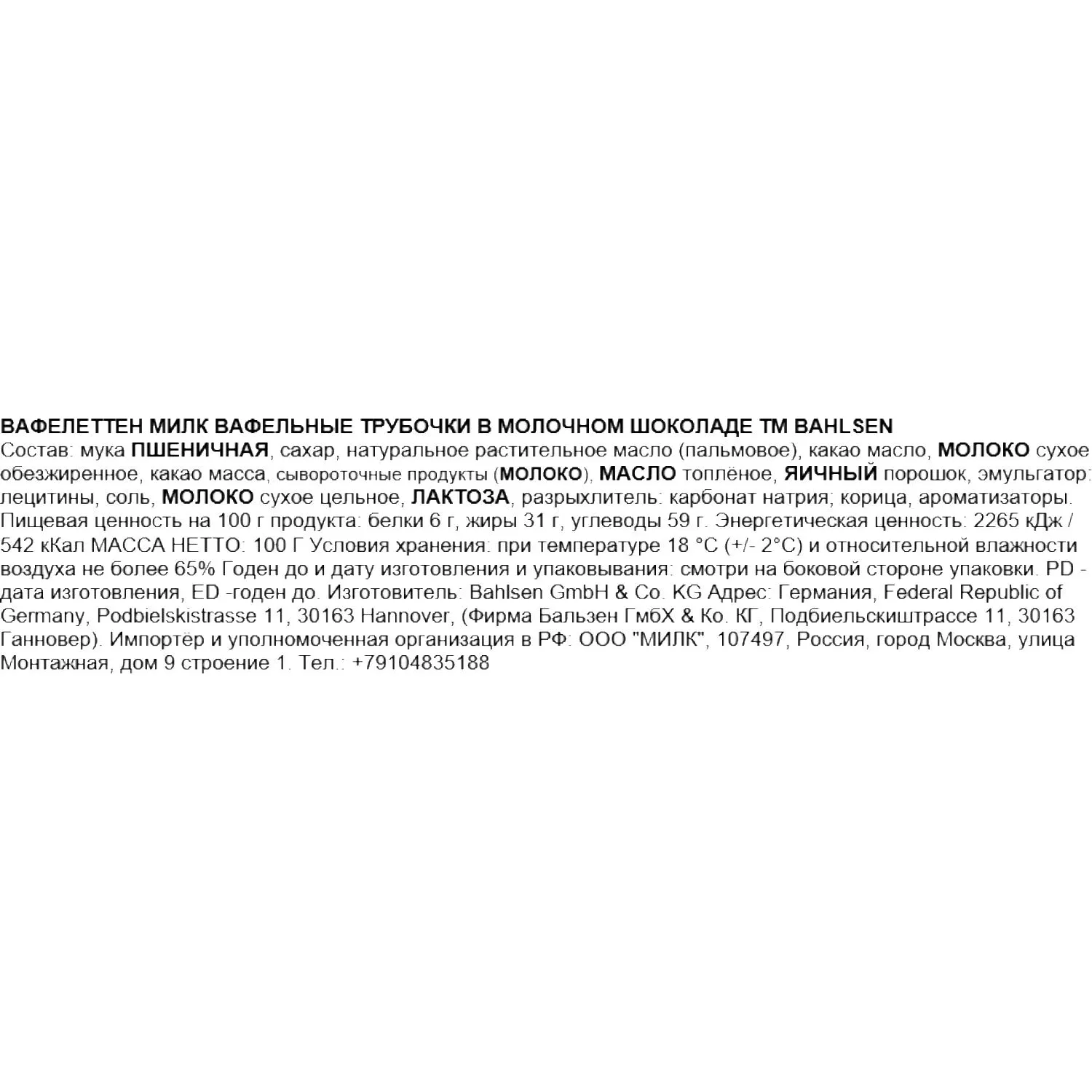 О товаре «Вафельные трубочки BAHLSEN "Waffeletten" в молочном шоколаде 100 г, ГЕРМАНИЯ»