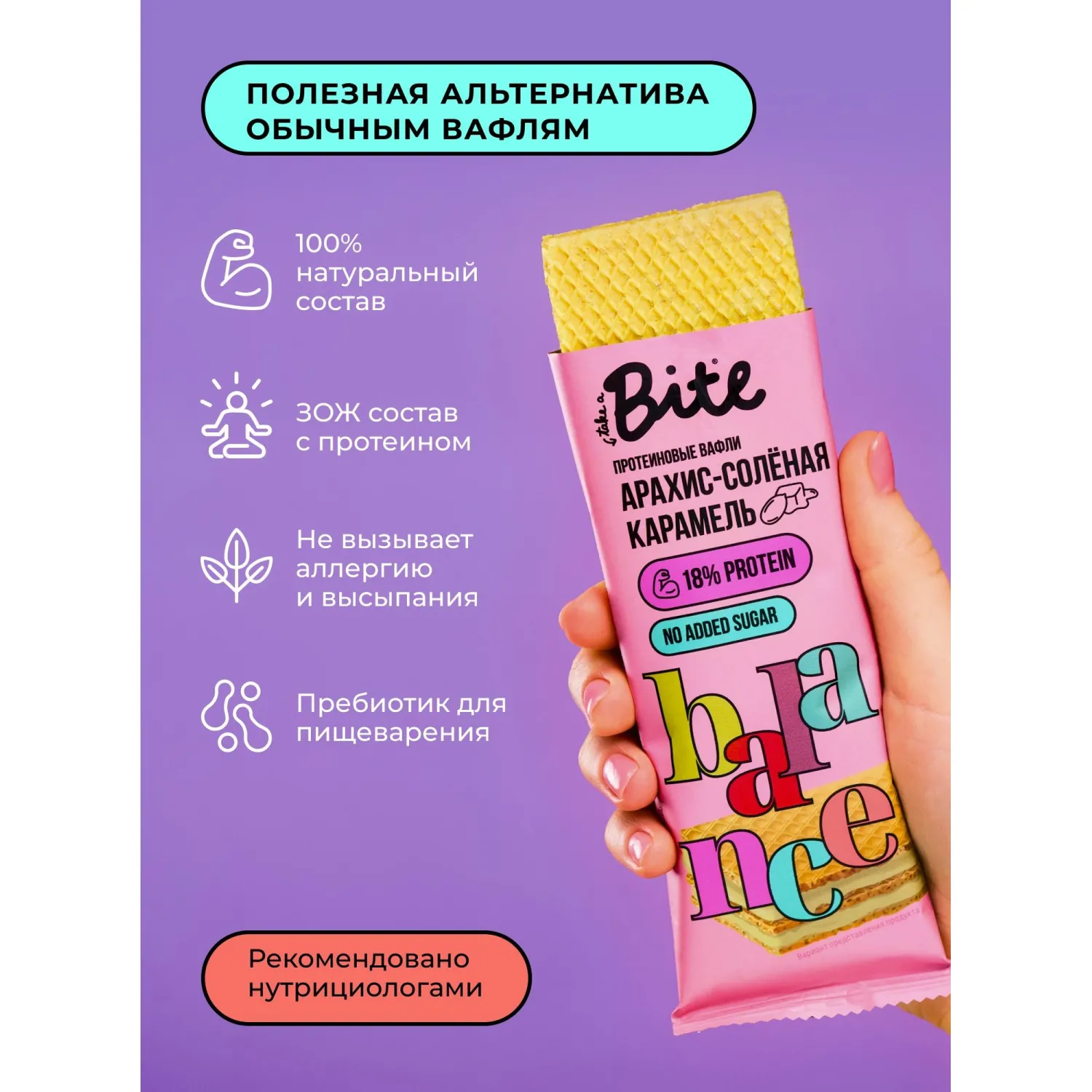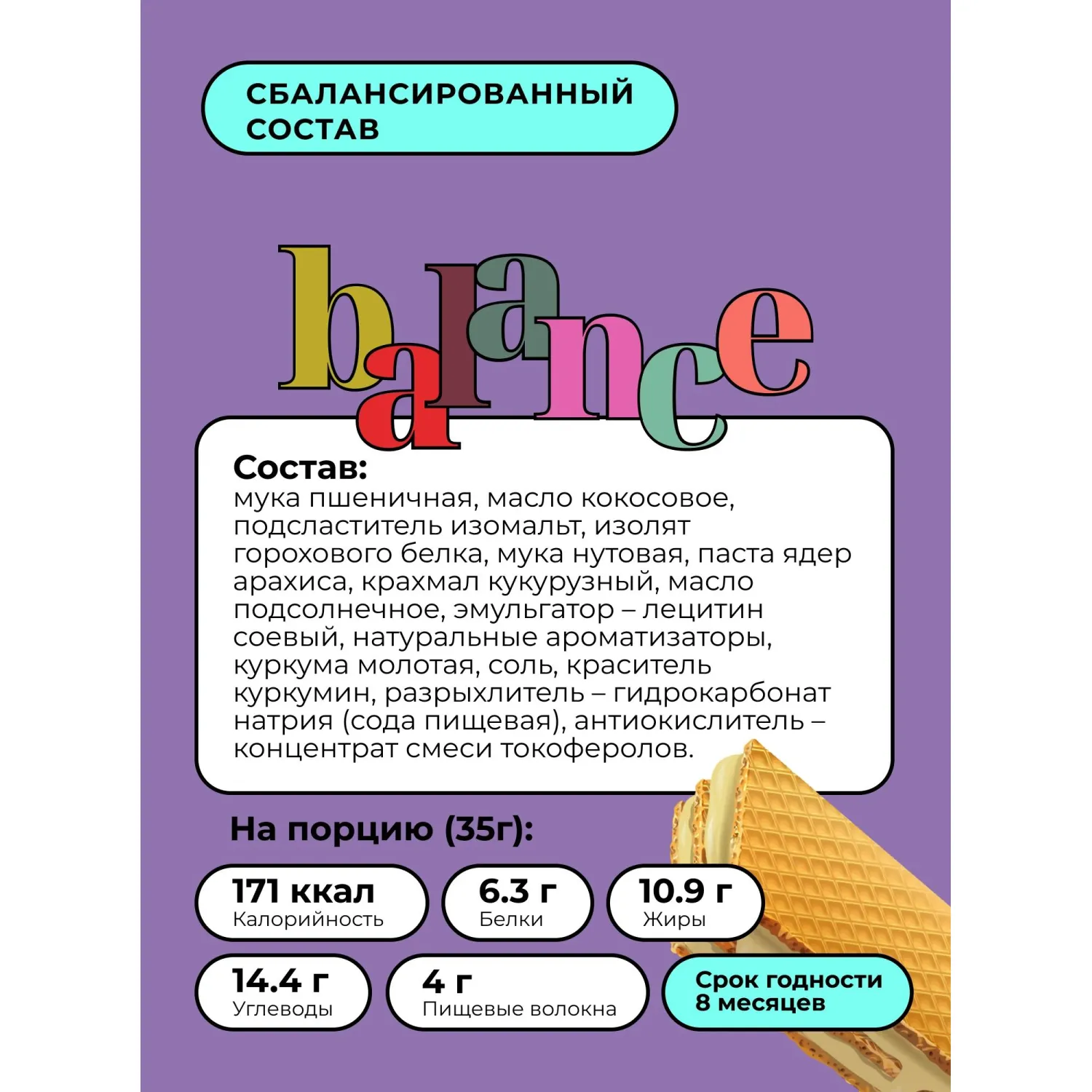 Состав включает нутовую и пшеничную муку, изолят горохового белка, подсолнечное масло, арахис, соль, натуральный ароматизатор, лецитин соевый, гидрокарбонат натрия и аскорбиновую кислоту. Вафли содержат 18% растительного протеина, богатого аминокислотами: лейцином, изолейцином и лизином. Начинка из натуральных компонентов придаёт нежный вкус с ноткой солёной карамели. Продукт не содержит молочных компонентов и подходит веганам.