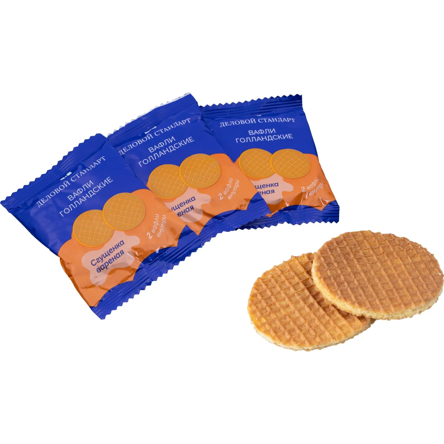 Вафли голландские Деловой стандарт с начинкой Вареная сгущенка 500 г — 2 вкусные вафли по 60 мм в индивидуальной упаковке. Отличаются нежным вкусом и насыщенным ароматом. Идеальны для чаепития, утреннего или вечернего перекуса.