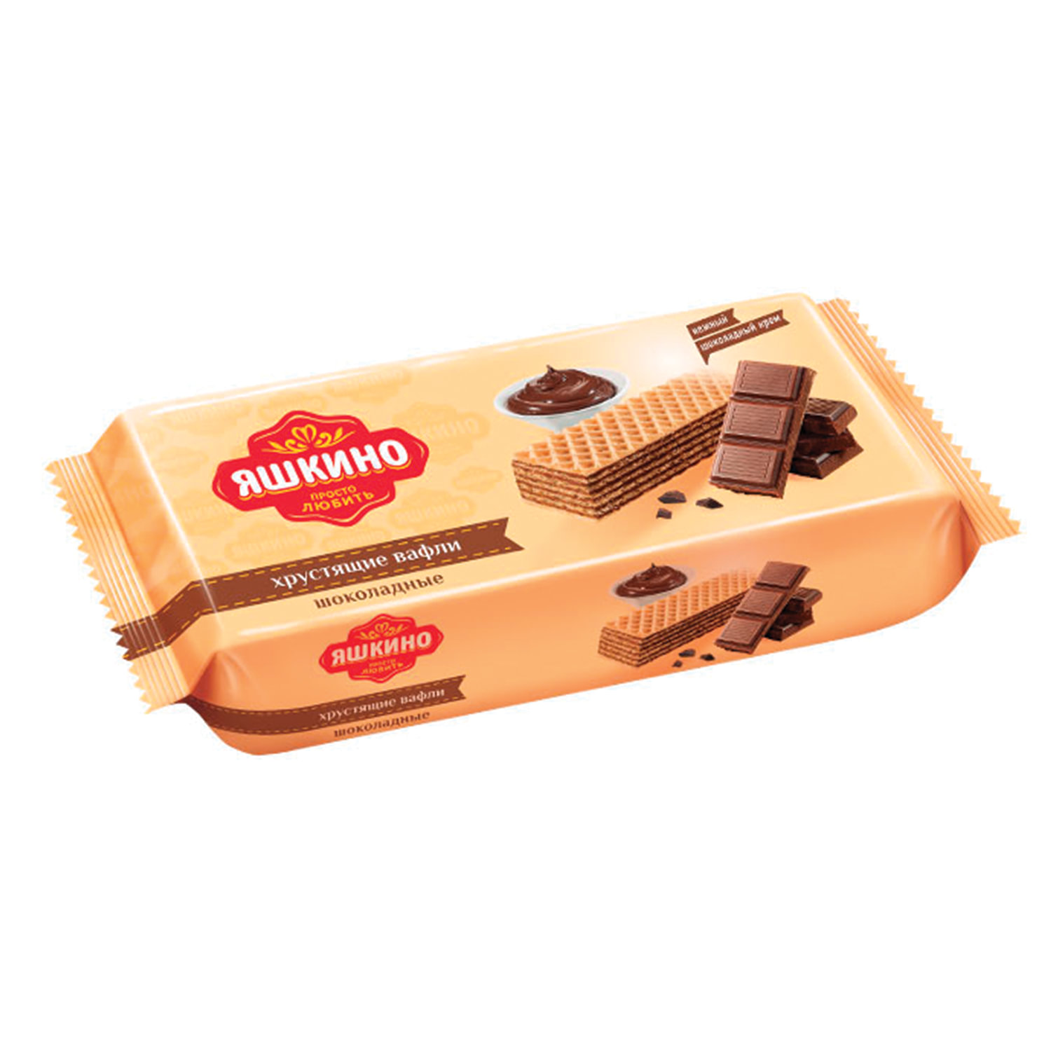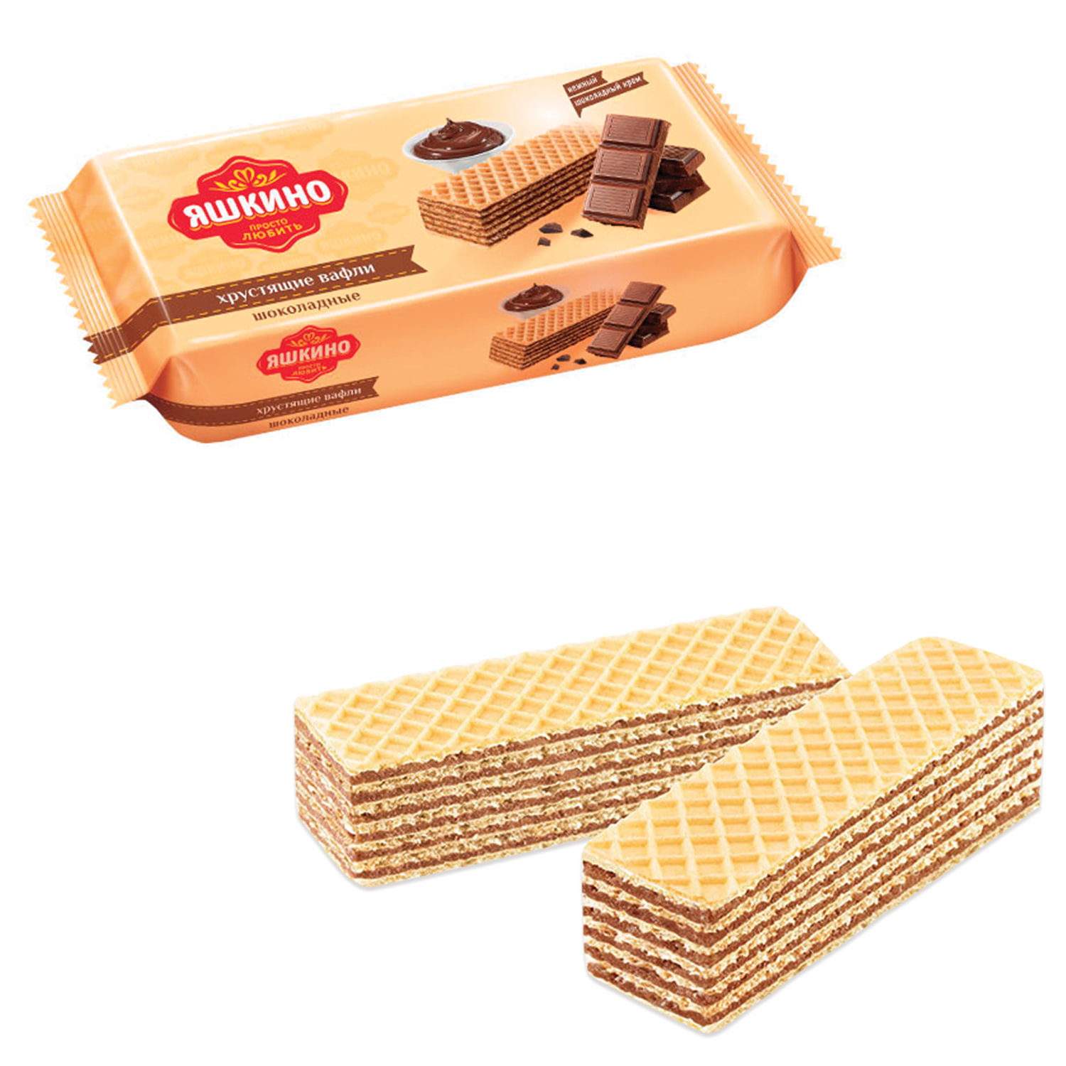 Вафли Яшкино Шоколадные 300 г. Семь слоев хрустящих вафель с начинкой из 100% натурального какао. Вафли насыщенно пропитаны шоколадным кремом, сделанным из какао и какао-масла отборных какао-бобов. Вкусный завтрак или вечернее чаепитие! Состав: мука пшеничная в/с, сахар, растительные масла, какао-порошок, крахмал кукурузный, эмульгатор: лецитины соевые; соль, какао-масло, какао тертое, антиокислитель: Токоферолы, концентрат смеси; разрыхлители: гидрокарбонат аммония, гидрокарбонат натрия. Может содержать следы молочных продуктов, арахиса орехов, диоксида серы. Пищевая ценность: на 100 г — белки 6 г, жиры 31 г, углеводы 60 г. Энергетическая ценность: на 100 г — 540 ккал. Условия хранения: хранить при температуре (18 ± 3) С, относительной влажности воздуха не более 70%.