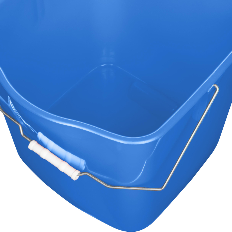 Ведро выполнено из прочного пластика и предназначено для уборки и перемещения жидкостей. Оно имеет квадратную форму с удобным носиком для переливания продуктов. Ведро оснащено металлической ручкой, крепящейся к коротким сторонам, что минимизирует расплёскивание жидкости при переноске.