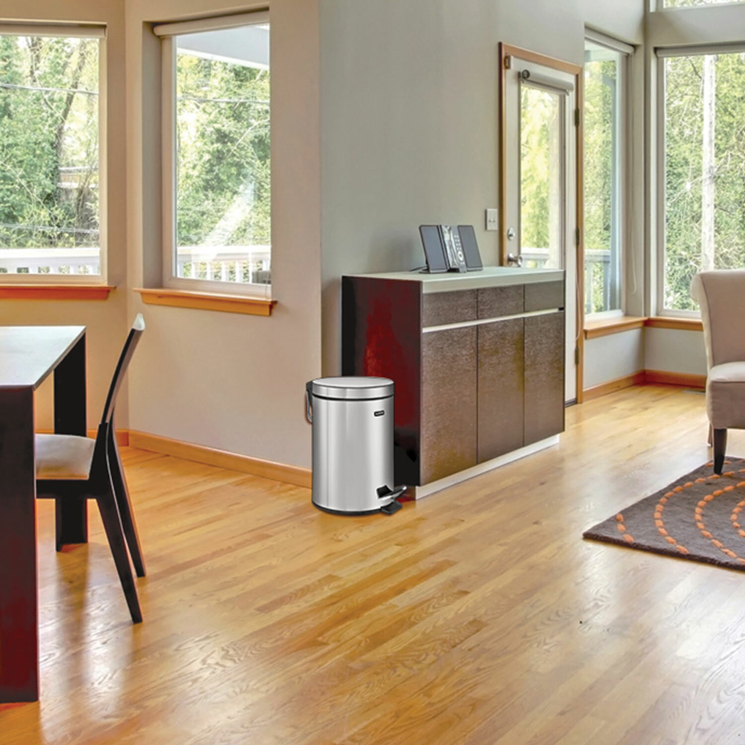 5 л – подходящий объем при небольшой проходимости. Оборудовано педалью для открывания. Крышка плотно прилегает, тем самым препятствуя распространению запахов. Внутреннее съемное пластиковое ведро имеет удобную рукоятку для извлечения. Изготовлено из нержавеющей стали со специальным антикоррозийным покрытием, что обеспечивает максимально долгий срок службы. Ведро устойчиво благодаря антискользящему основанию. Объем рекомендуемого мешка – 12 л. Контейнер для мусора в стальном цвете с зеркальным покрытием имеет компактные размеры (28х20,5х20,5 см) и отлично впишется в любой интерьер.