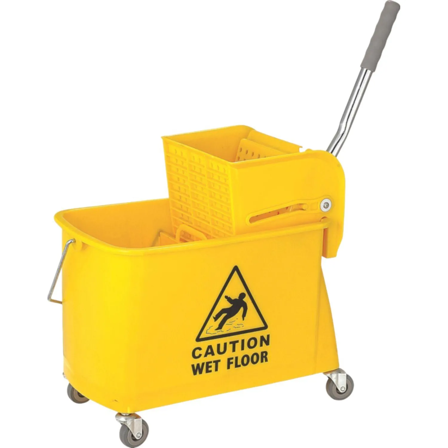 Ведро на колесах с механическим отжимом для швабр двух типов: плоского флаундерa и Кентукки . Изделие изготовлено из ударопрочного пластика, его габариты составляют 47x27 см. Ведро имеет две секции (перегородка съемная), перекидную металлическую ручку и поворотные колеса из стали, оснащенные пластиковыми протекторами. Емкость ведра - 20 литров. По обеим сторонам инвентаря имеется знак Осторожно, скользко . Относится к сегменту суперэконом - товар с минимальными требованиями к качеству для тех, кто хочет сэкономить. Товар отвечает основным потребительским характеристикам.