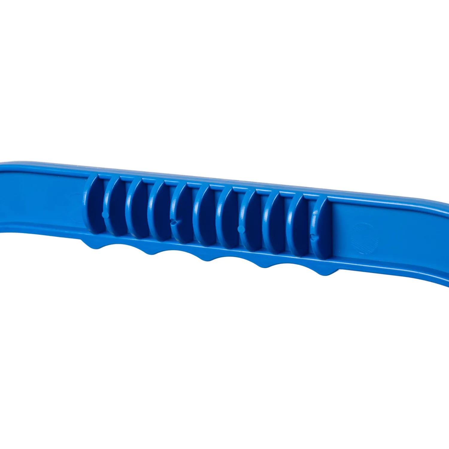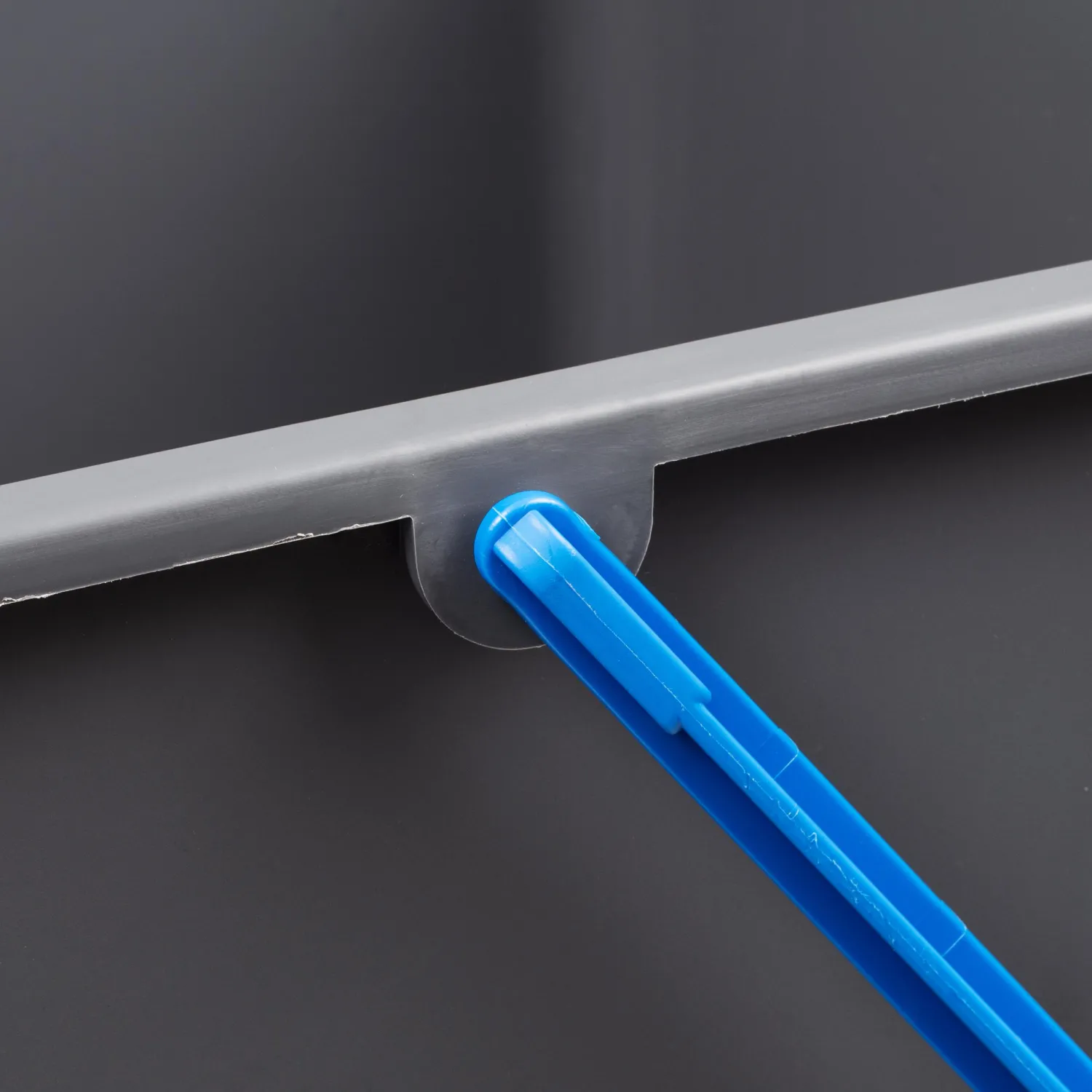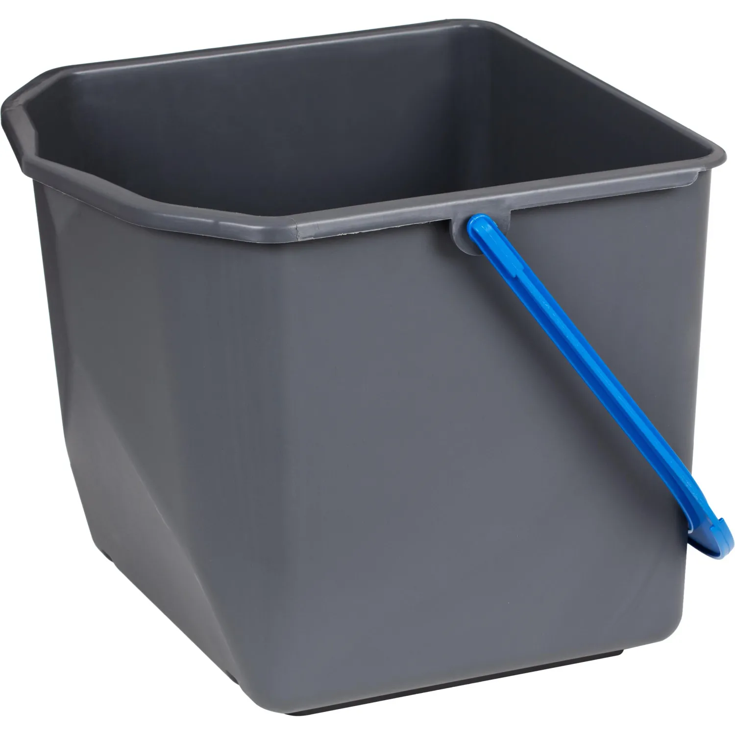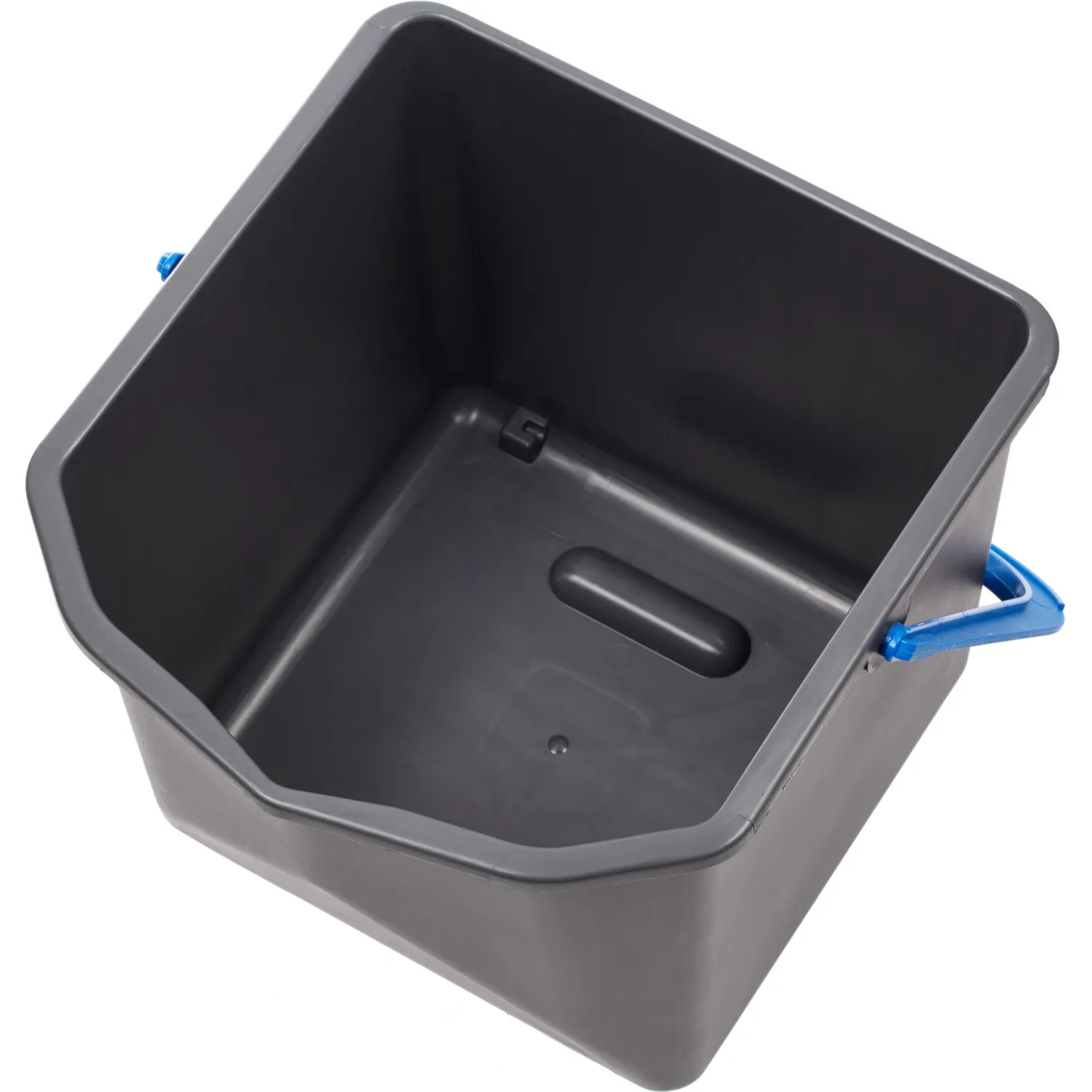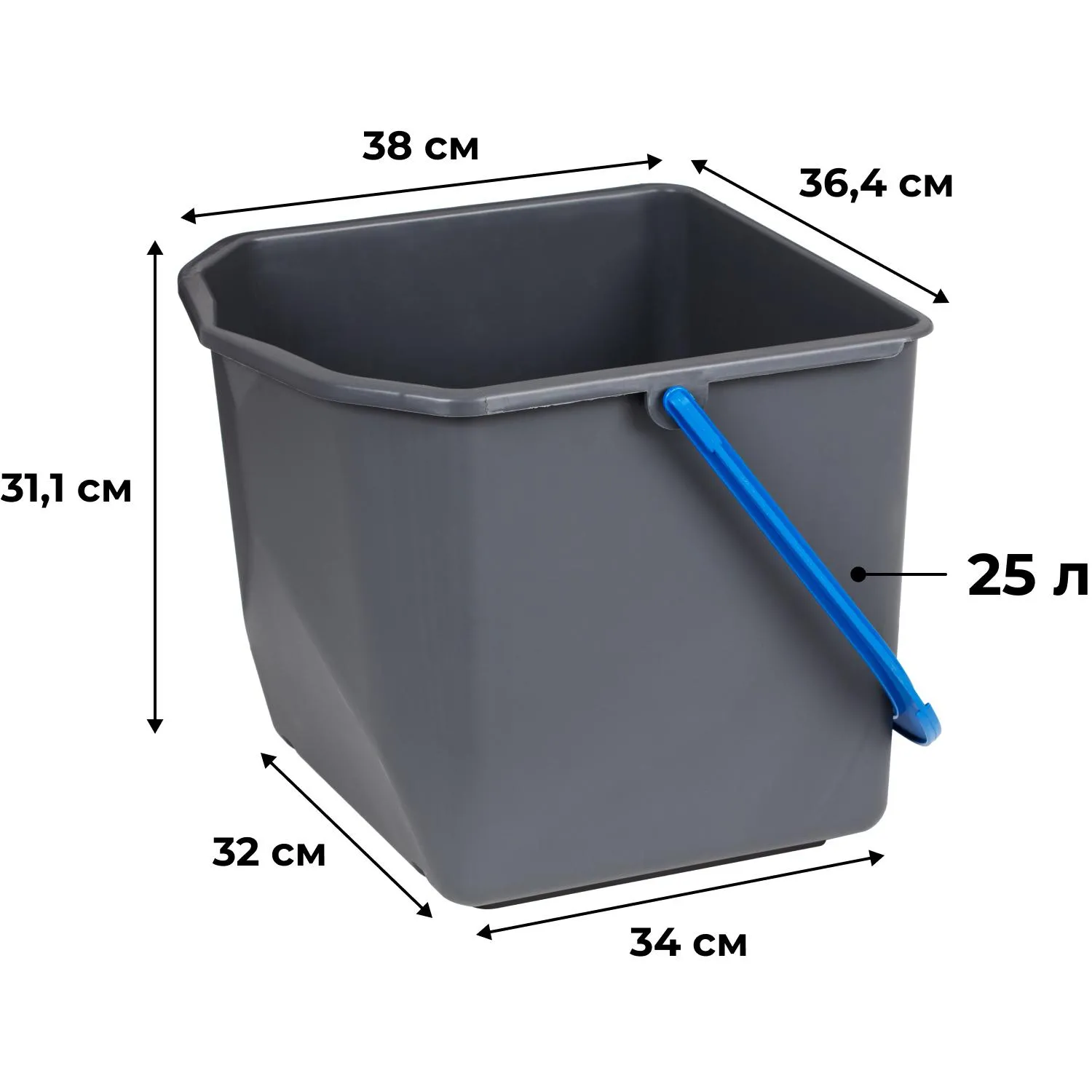 Ведро объёмом 25 л выполнено из ударопрочного пластика в сером цвете с синей ручкой для цветовой кодировки. На внутренней поверхности нанесена мерная шкала с делением по 1 л, что позволяет точно рассчитывать концентрацию моющих растворов.