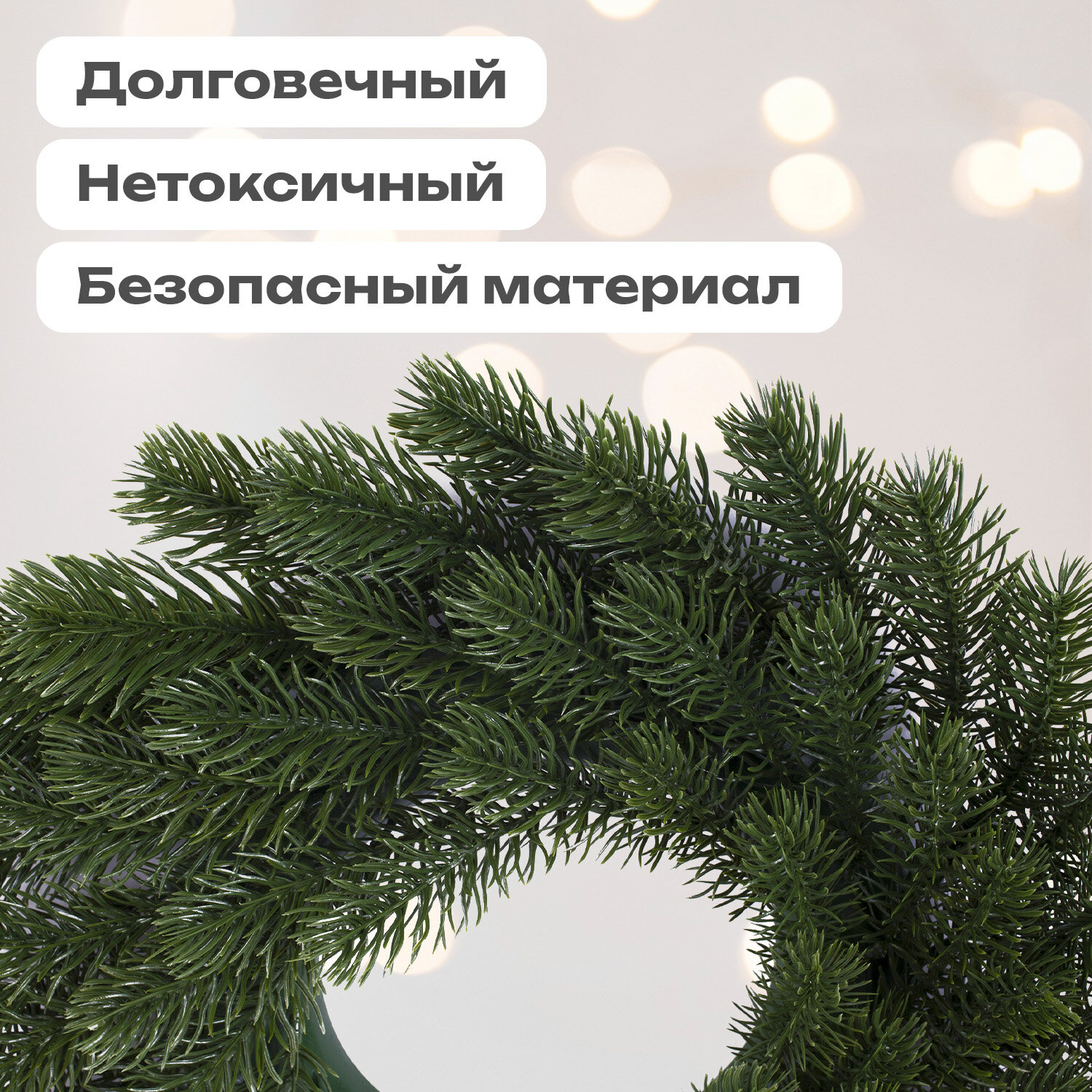 Материал – 100% литой ПЭТ. Цвет хвои – зелёный. Венок из литой ели выглядит, как натуральный, и создает особую праздничную атмосферу.