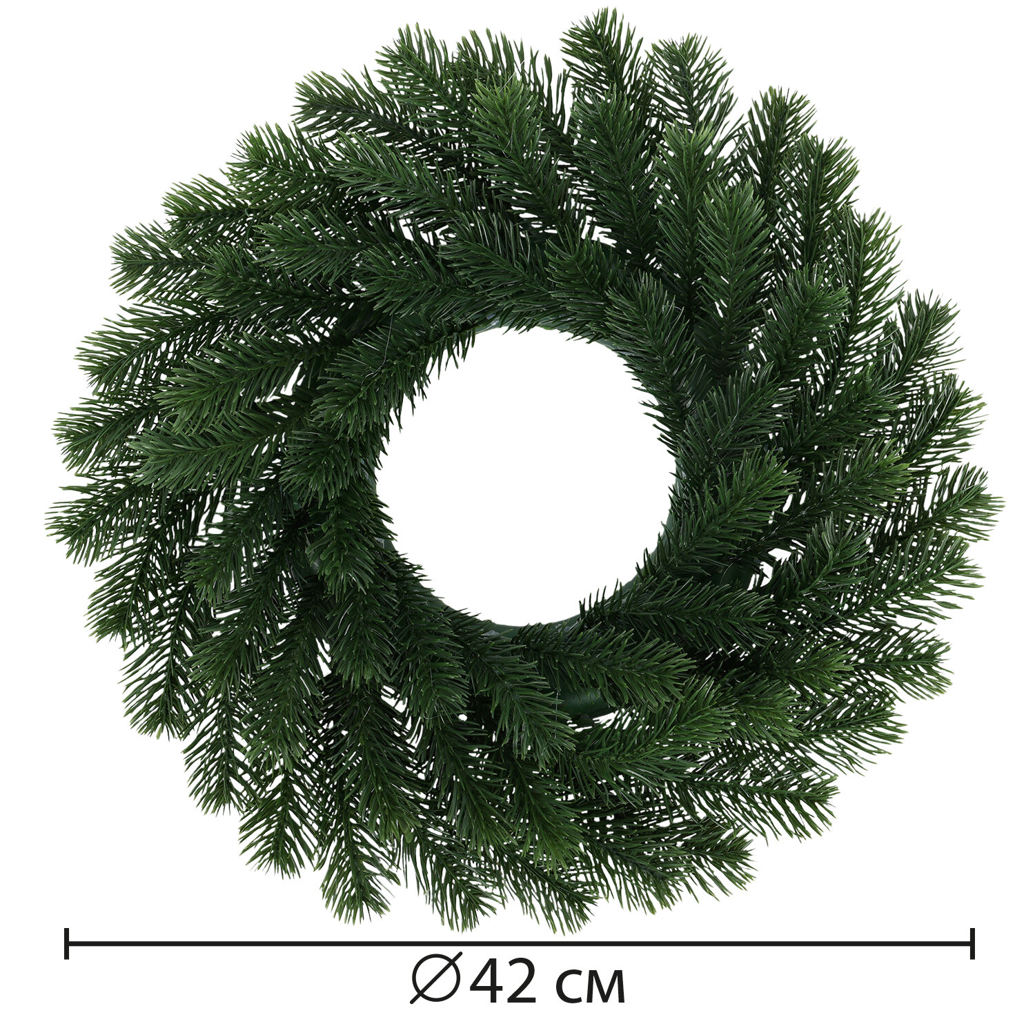 Венок новогодний, диаметром 42 см представляет собой конструкцию из пластикового каркаса и закрепленных к нему ветвей.