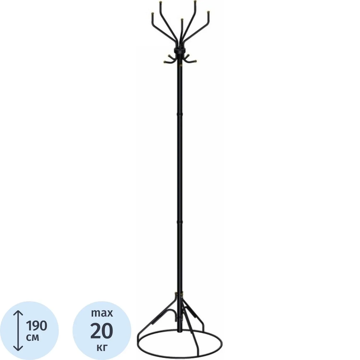 Вешалка напольная. Нагрузка на нижний крючок для одежды — 5 кг. Нагрузка на верхний крючок для головных уборов — 1 кг. Материал — металл. Максимально допустимая нагрузка — 15 кг.