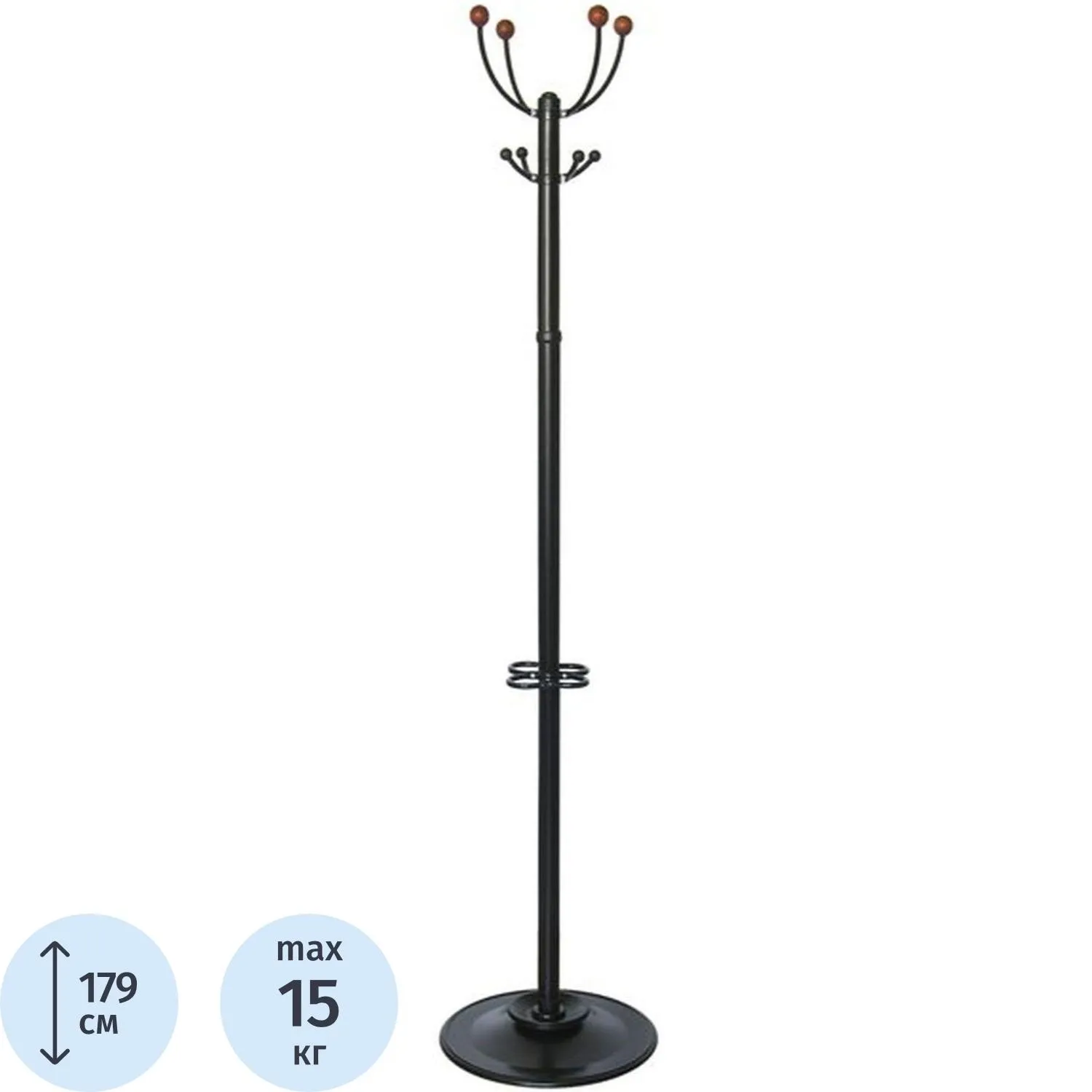 Вешалка напольная Квартет 3 с подставкой для зонтов. Каркас и основание выполнены из оцинкованной стали с полимерным покрытием. Вешалка напольная оснащена 4 крючками, окрашена в черный цвет. Нагрузка на верхний крючок для головных уборов — 1 кг. Нагрузка на нижний крючок для одежды — 5 кг. Максимально допустимая нагрузка — 15 кг.