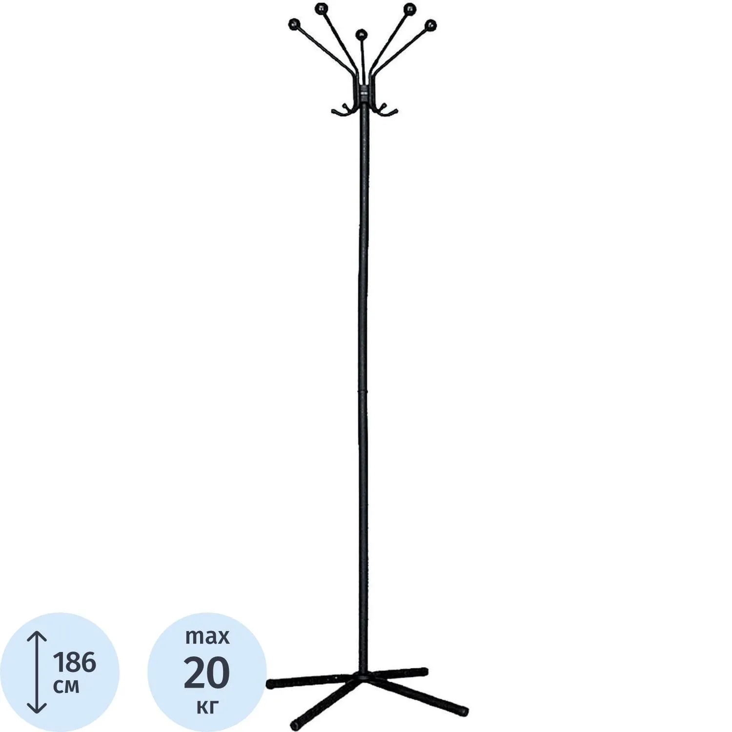 Напольная вешалка высотой 186 см изготовлена из стали с покрытием черного цвета. Состоит из крестовидного основания размером 70×70 см и штанги-стойки. Не занимает много места, подходит для дома и офиса. В верхней части расположены крючки и рожки для пяти предметов одежды и головных уборов. Нагрузка на нижний крючок для одежды — 4 кг. Нагрузка на верхний крючок для головных уборов — 1 кг. Изделие поставляется частично покрытым цветной защитной пленкой, которую необходимо удалить перед использованием. Максимально допустимая нагрузка — 20 кг.