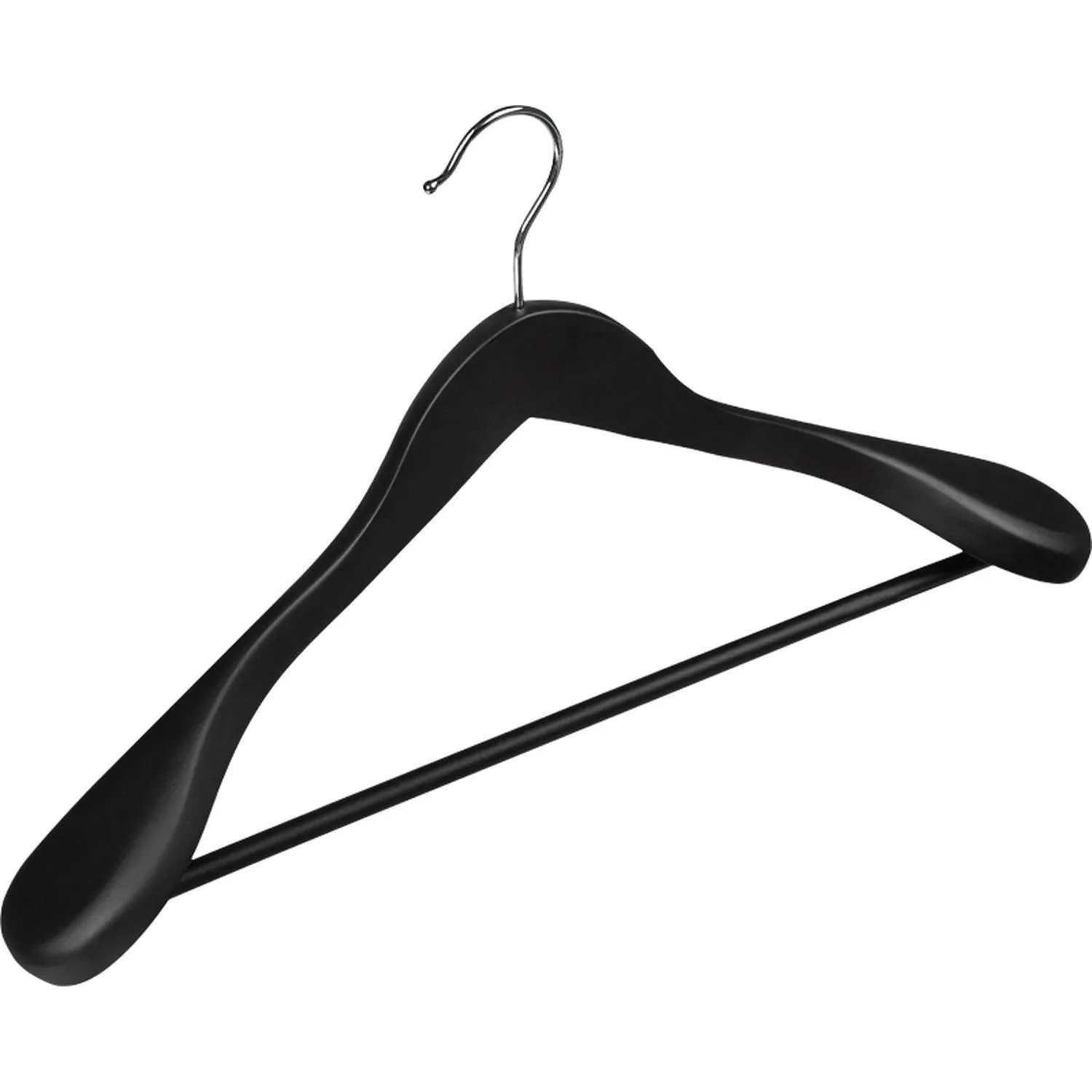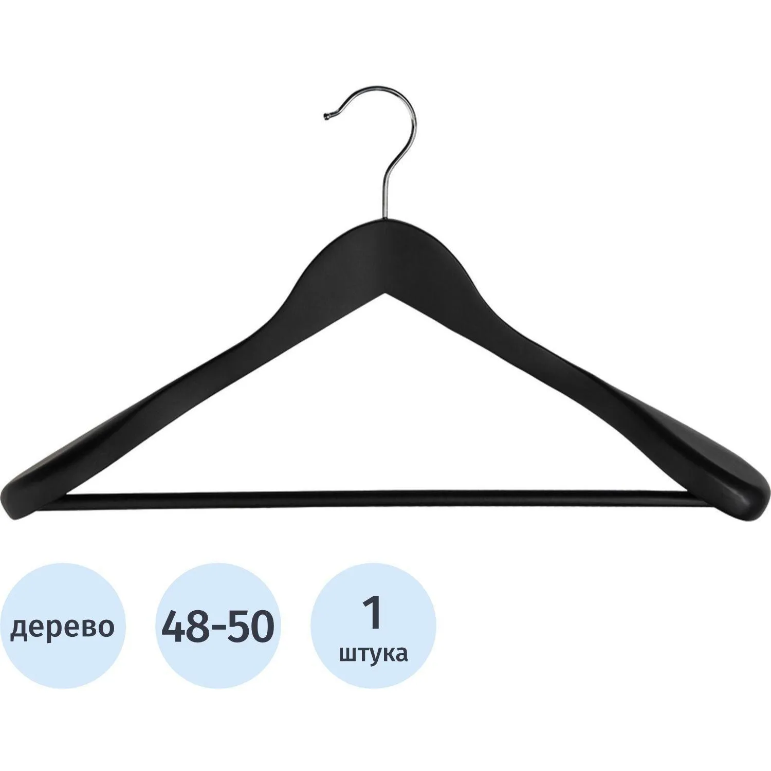 Анатомическая вешалка-плечики размера 48-50 классического черного цвета с перекладиной для брюк, юбок. Имеет антискользящее резиновое покрытие на всю площадь вешалки. Изготовлена из натуральной древесины (шима суперба). Металлический крючок вращается.