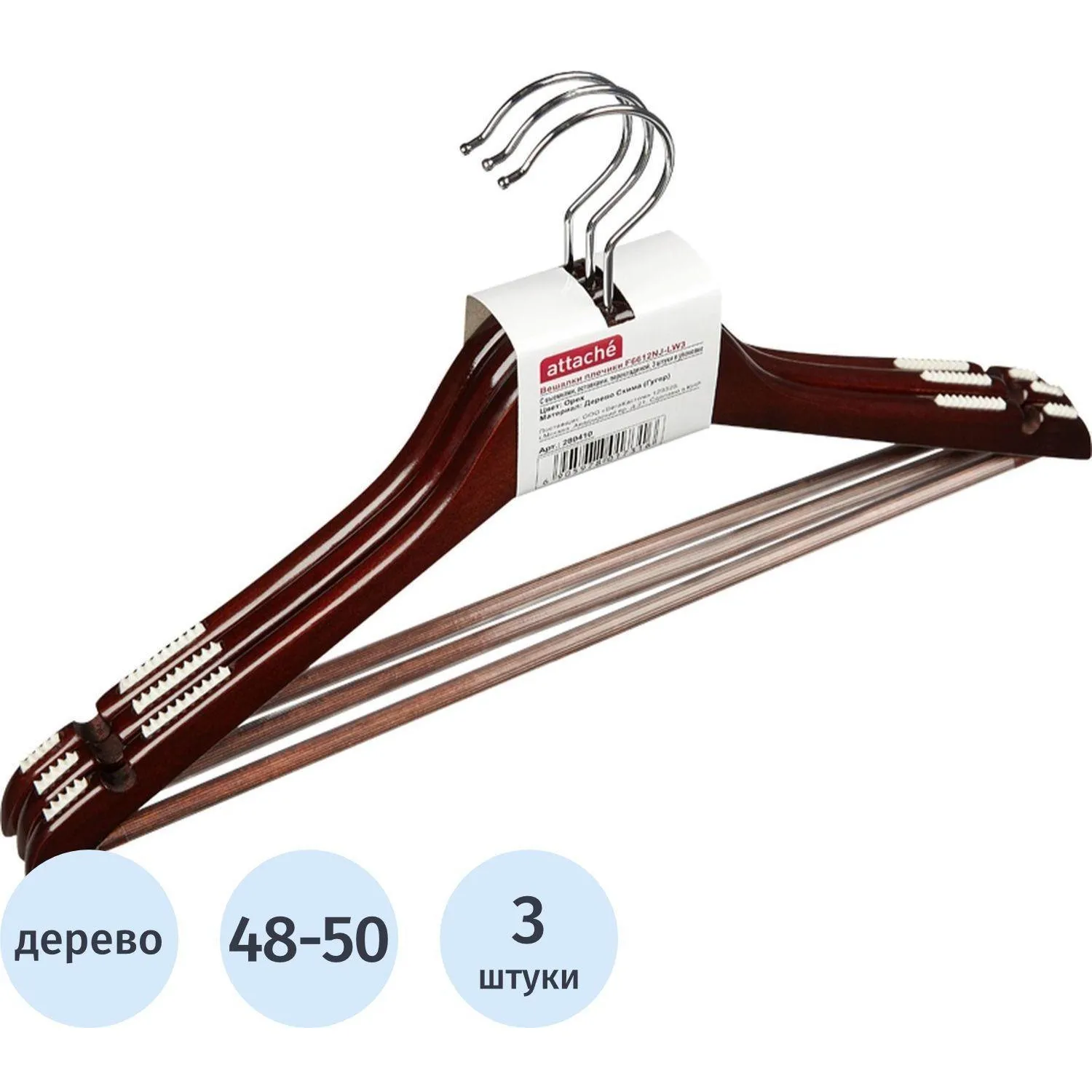 О товаре «Вешалка-плечики Attache F6612NJ-LW3 деревянная с выемками и перекладиной (размер 48-50, орех, 3 штуки в упаковке)»