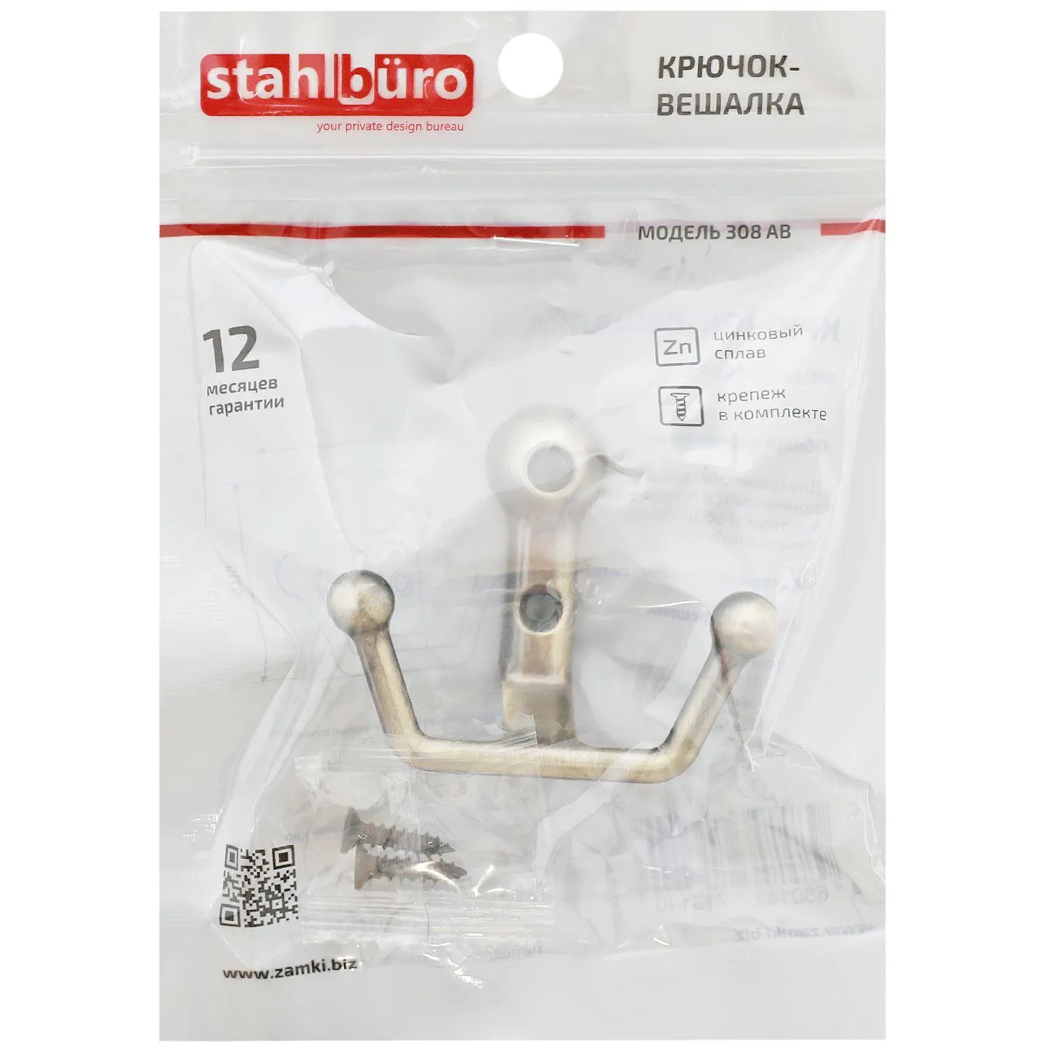 Вешалка настенная StahlBuro. Крючок-вешалка двухрожковый. Материал — цинковый сплав. Крепёж в комплекте.