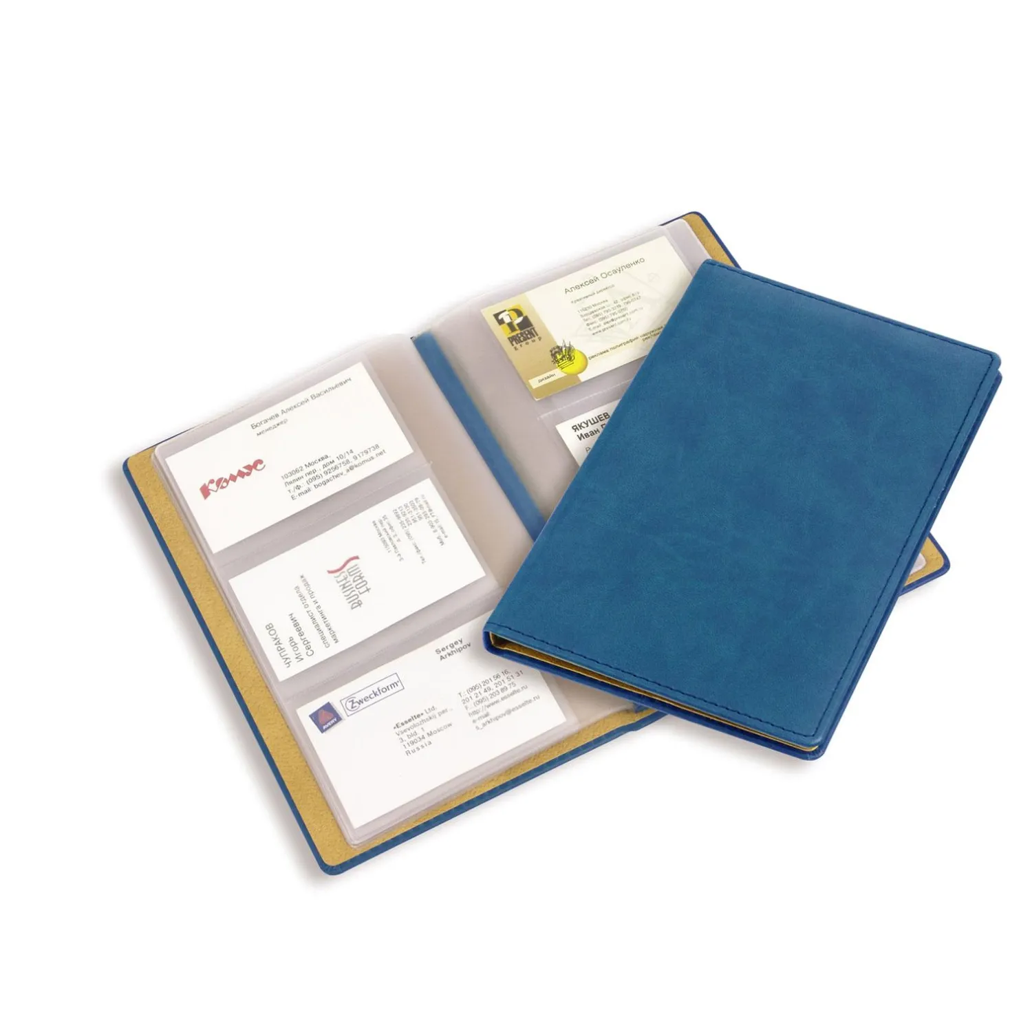 Вертикальная настольная визитница Attache из коллекции «Вива» имеет твердую обложку синего цвета, изготовленную из искусственной кожи с защитным лакированным покрытием. Размер — 133×202 мм. 36 карманов из прозрачного полипропилена вмещают 72 визитные карточки или банковские карты стандартного размера. Каждое отделение предполагает хранение 2-х визиток. Материал обложки подходит для нанесения логотипа любым способом тиснения.