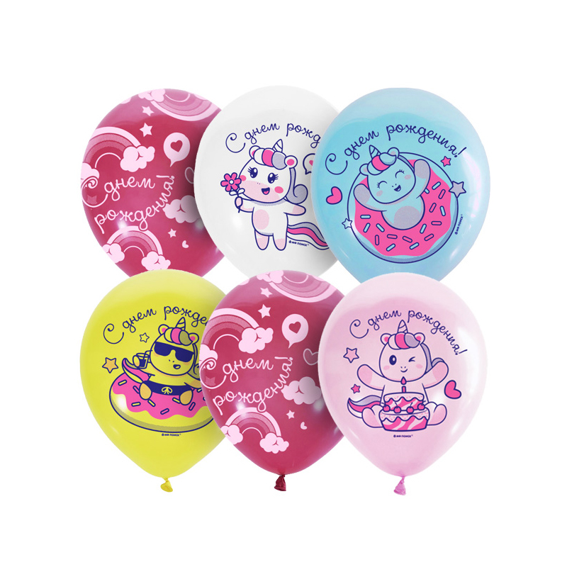 Шары с рисунками милых и веселых единорогов и поздравительными надписями отлично подойдут для любого детского праздника.