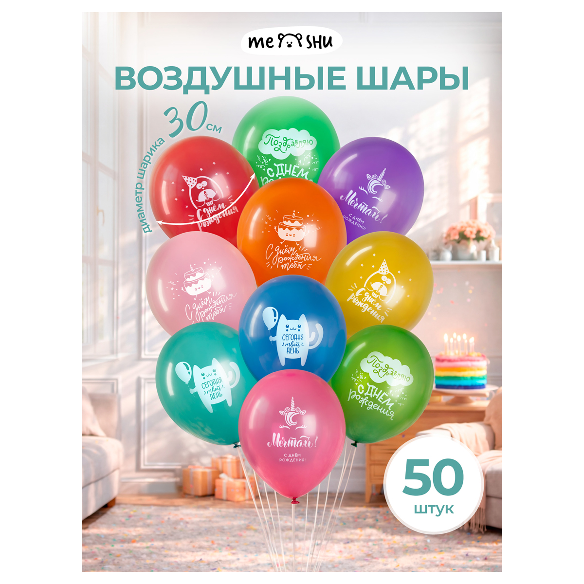 О товаре «Воздушные шары, 50шт., М12/30см, MESHU "С Днем Рождения", пастель, ассорти»