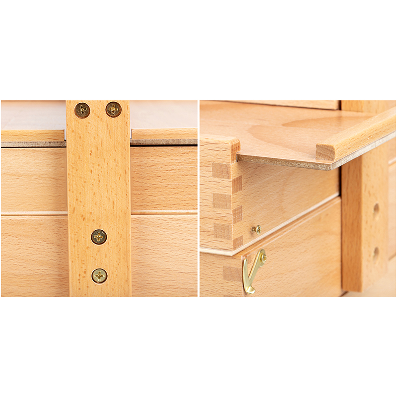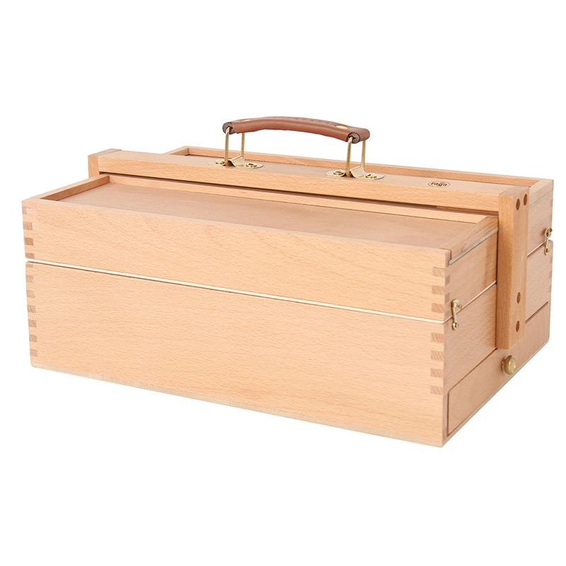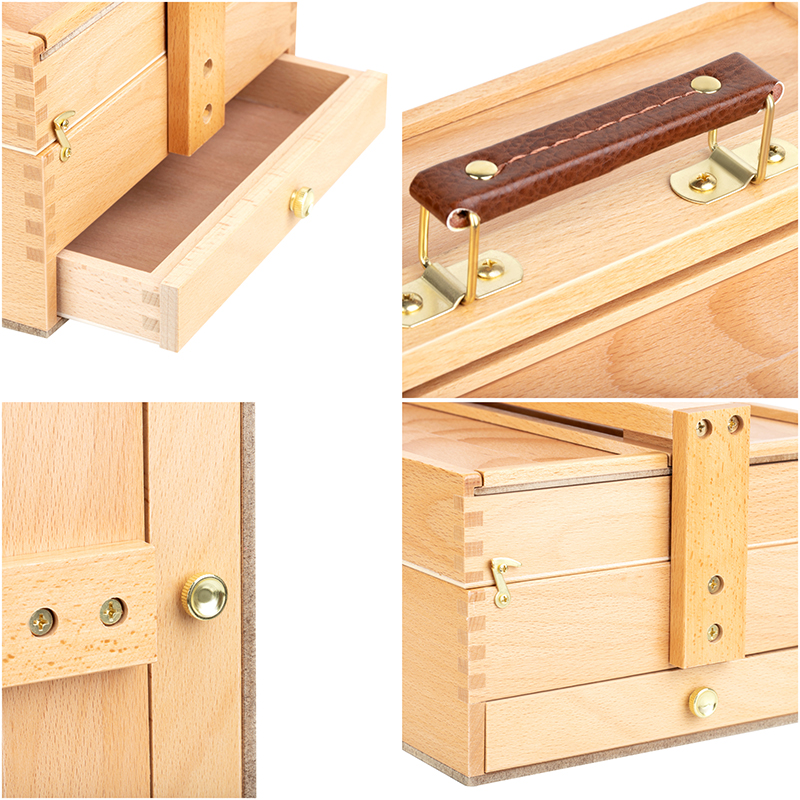 Оснащён многоуровневой системой хранения с выдвижным ящиком для кистей и красок. Снабжён ручкой для переноса, поэтому его удобно хранить и брать с собой. Изготовлен из лакированного бука.