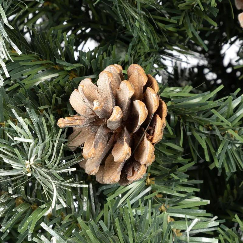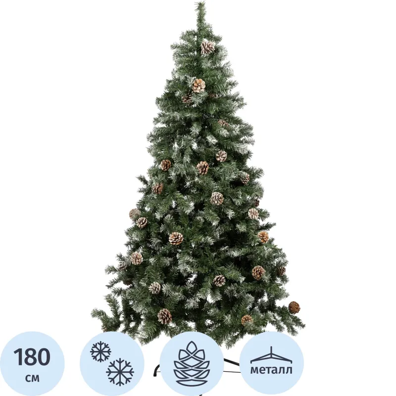 Искусственная напольная ёлка высотой 1.8 м выполнена в заснеженном стиле и украшена натуральными шишками. Хвоя из прочного ПВХ зелёного цвета покрыта искусственным снегом, создающим эффект морозного инея. Крона густая и равномерно распределена по высоте, что придаёт изделию декоративный и реалистичный вид.