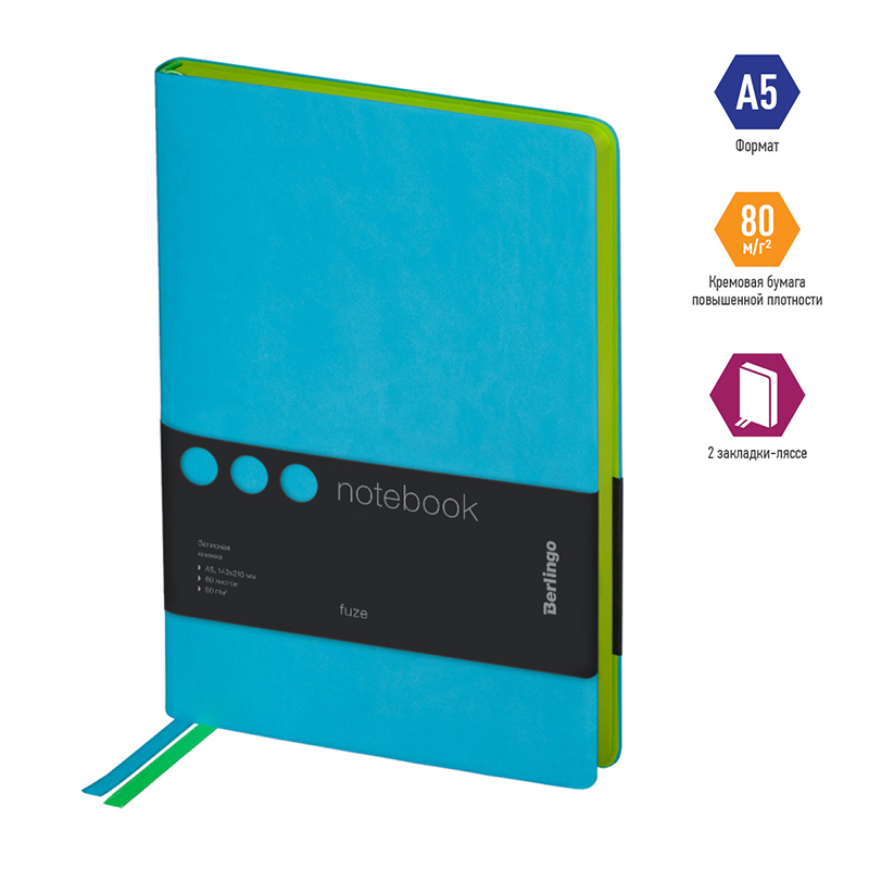 Записная книжка Berlingo Fuze формата A5 с ультрамягкой обложкой – это яркий взгляд на ежедневное планирование. Бирюзовый цвет записной книжки контрастирует с салатовым срезом. Прошитый внутренний блок из 80 листов кремовой бумаги повышенной плотности 80 г/м² имеет перфорированные уголки и линовку в клетку. Записная книжка Berlingo Fuze подходит под персонализацию, внутри 2 удобные закладки-ляссе. В подарок – 3 комплекта стикеров с латинским, русским алфавитом и пиктограммами. Записная книжка представлена в размере 143*210 мм.