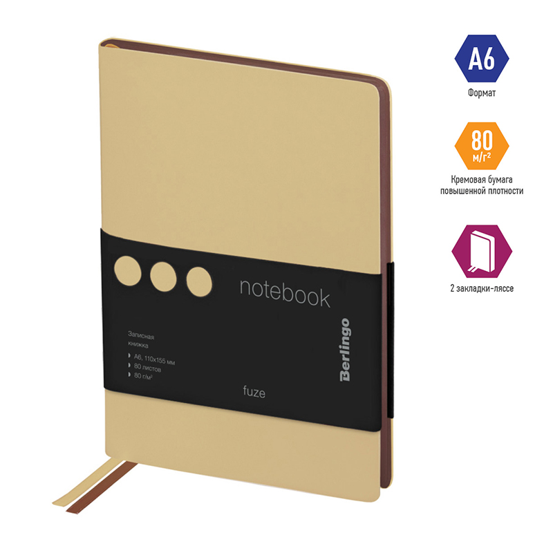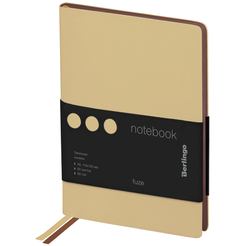 Яркая записная книжка Berlingo Fuze формата А6 с ультрамягкой обложкой – это свежий взгляд на ежедневное планирование. Бежевый цвет записной книжки контрастирует с коричневым срезом. Прошитый внутренний блок из 80 листов кремовой бумаги повышенной плотности 80 г/м² имеет перфорированные уголки и линовку в клетку. Записная книжка Berlingo Fuze подходит под персонализацию, внутри 2 удобные закладки-ляссе. В подарок – 3 комплекта стикеров с латинским, русским алфавитом и пиктограммами. Записная книжка представлена в размере 110*155 мм.