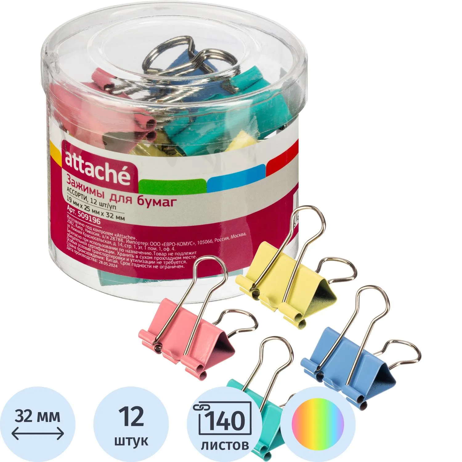 Металлические зажимы для бумаг Attache используются для скрепления документов без использования степлеров. Зажимы с цветным покрытием. Цвета зажимов в упаковке: желтый, синий, голубой, розовый. В одной упаковке зажимы трех размеров. Размеры зажимов: (ширина х высота х глубина закладки) 19×33×9 мм, 25×42×13 мм, 32×53×15 мм. Позволяют скреплять: зажимы шириной 19 мм — до 80 листов, 25 мм — до 100 листов, 32 мм — до 140 листов плотностью 80 г/кв.м, не деформируя при этом бумагу. Зажимы для бумаг поставляются по 12 штук в удобной для хранения пластиковой упаковке. В транспортном коробе 24 упаковки. В упаковке зажимов по 19 мм — 3 штуки, по 25 мм — 6 штук, по 32 мм — 3 штуки.
