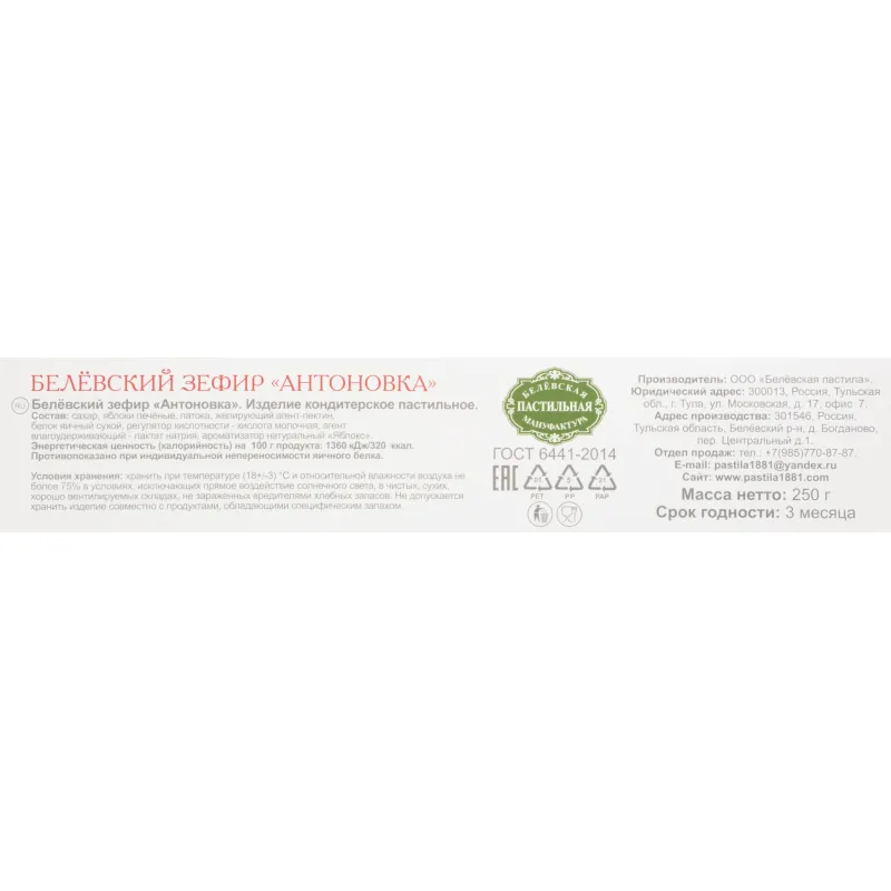 Поэтому белевский зефир имеет натуральный вкус, нежную текстуру, безупречное качество и легкую кислинку, которая отличает «антоновку». Эта сладость приведет в восторг и детей, и взрослых. Десерт станет украшением и праздничного, и будничного стола, поднимет настроение и очарует упоительным вкусом, не усиленным химически-гастрономическими добавками. Зефир классической формы упакован в пленку и картон.