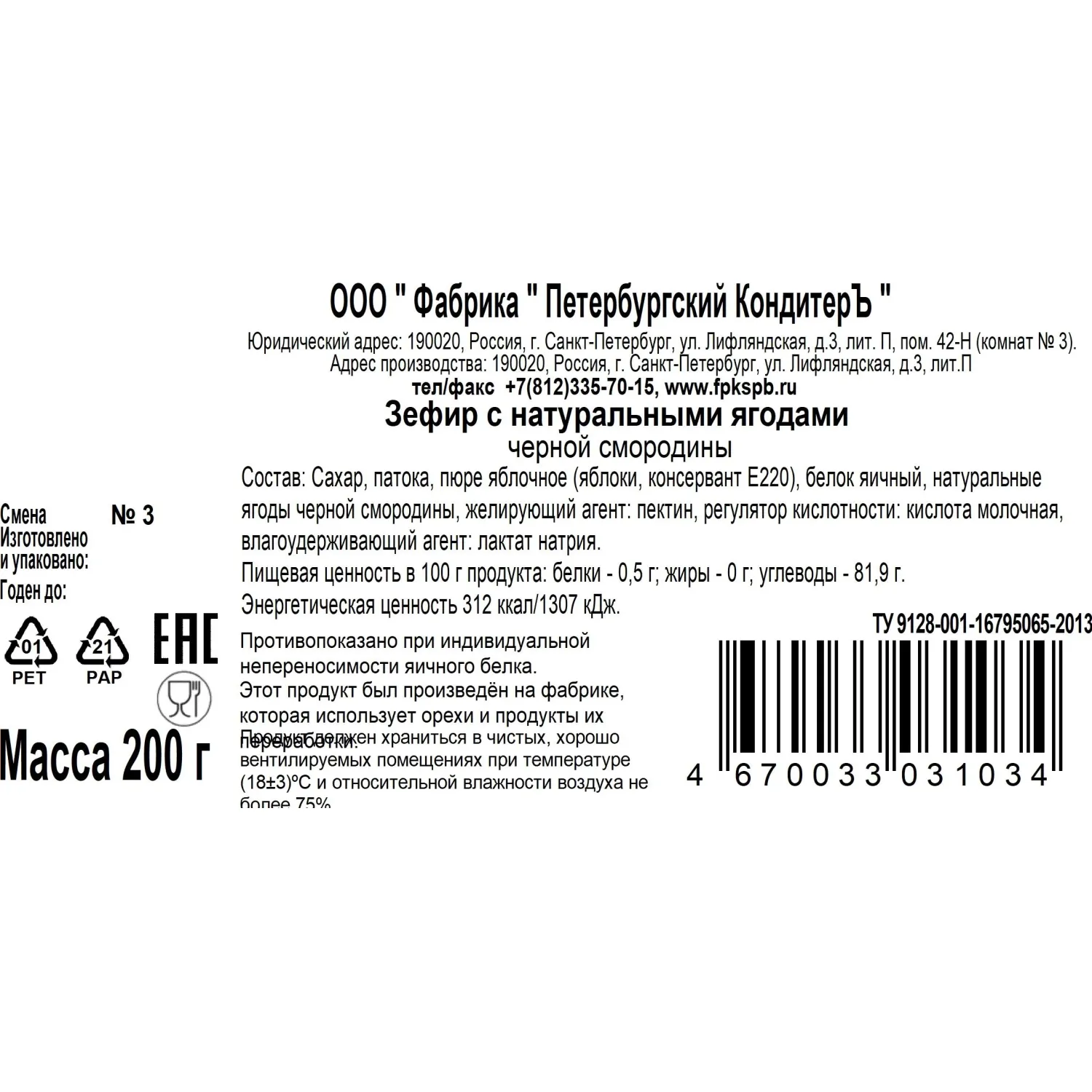 Состав: сахар, патока, пюре яблочное (яблоки, консервант E220), белок яичный, натуральные ягоды чёрной смородины, желирующий агент: пектин, регулятор кислотности: кислота молочная, влагоудерживающий агент: лактат натрия.