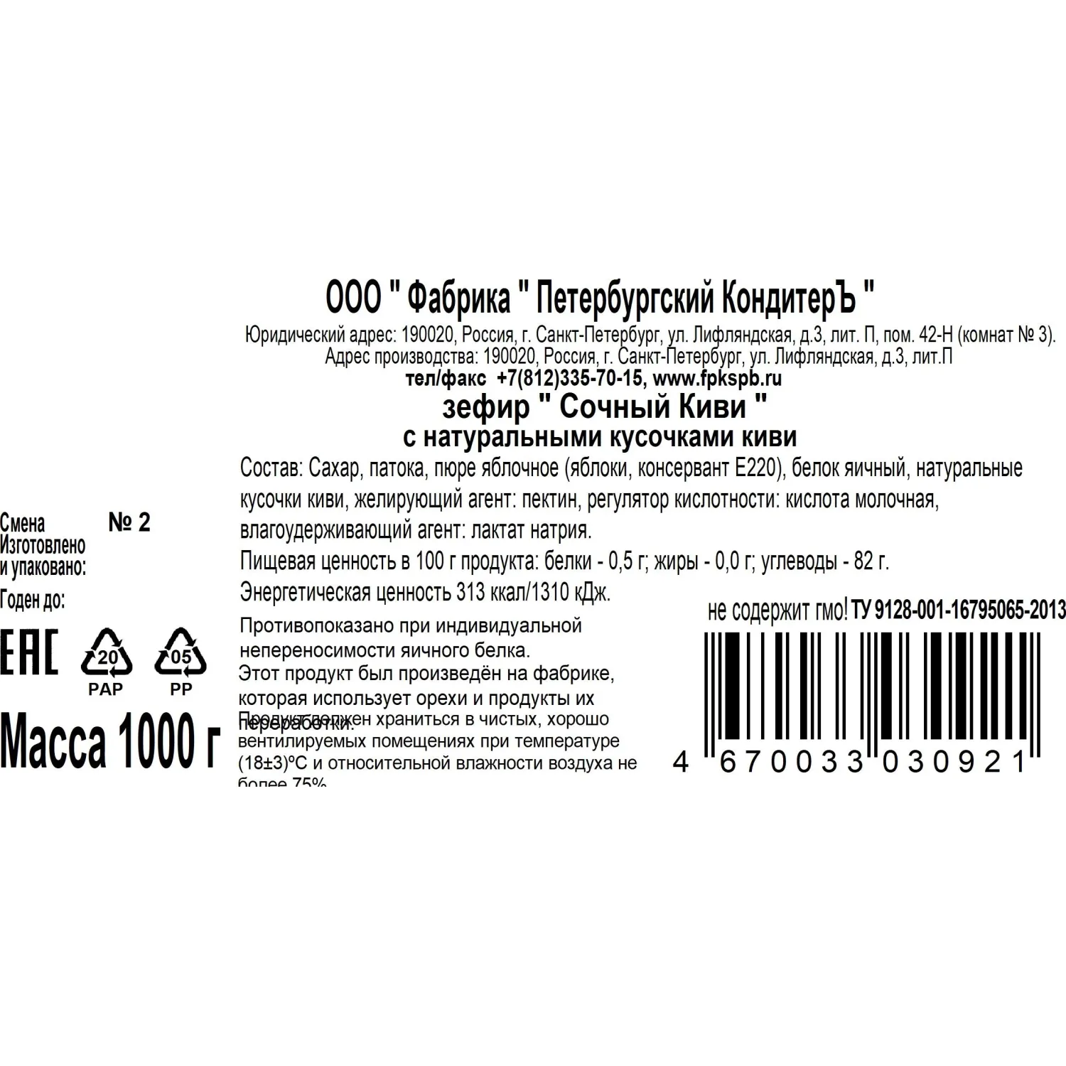 Зефир Сочный Киви Петербургский КондитерЪ с натурал кусочками киви, TV, 1кг