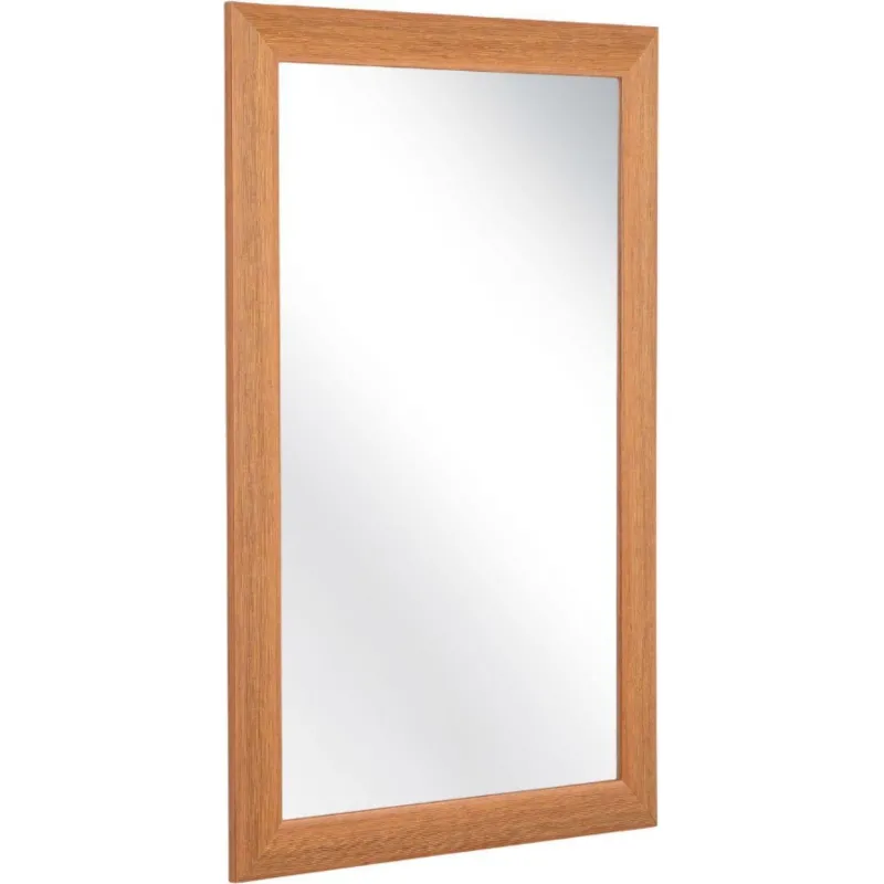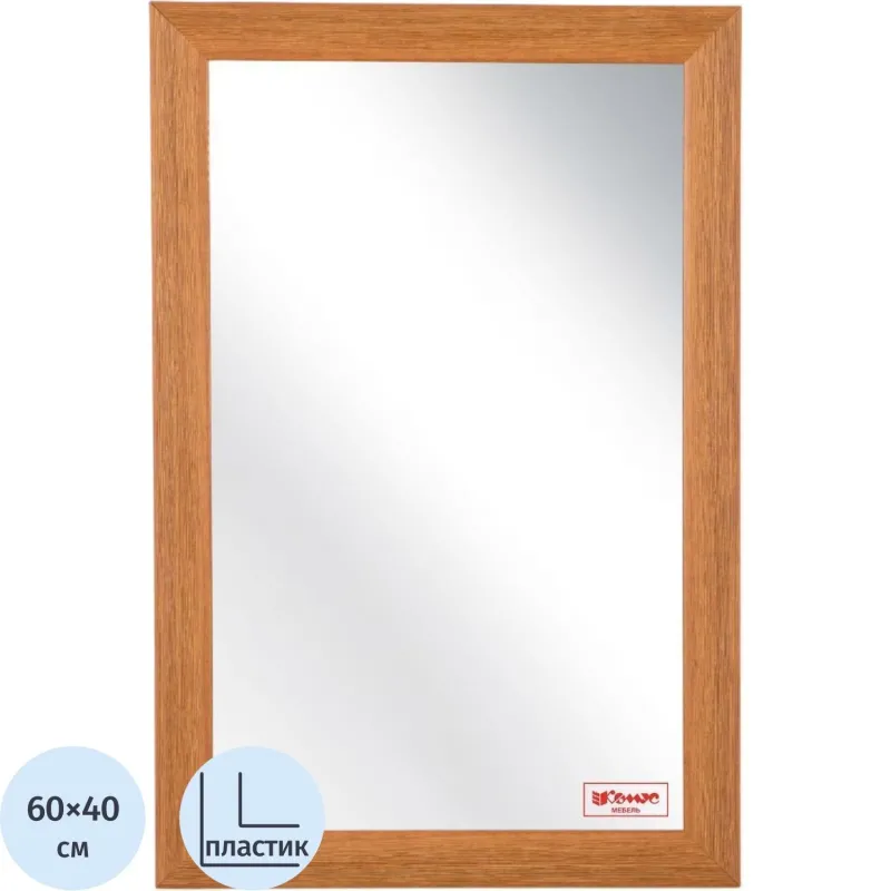 Зеркало настенное Комус Мебель НБ68 в багетной раме из влагостойкого вспененного полистирола. Зеркальное полотно марки Mirrox 3G влагостойкое, экологически чистое. Толщина составляет 4 мм. Размер 40×60 см. Зеркало обрамлено влагостойкой рамой из ПЛС цвета бук, ширина рамы — 40 мм. Упаковано в целлофан, в коробку из трёхслойного ударостойкого гофрокартона марки Т24. Крепежи к стене — скрытые пластины, позволяющие вешать зеркало как вертикально, так и горизонтально. В комплекте имеется дюбель-костыль.