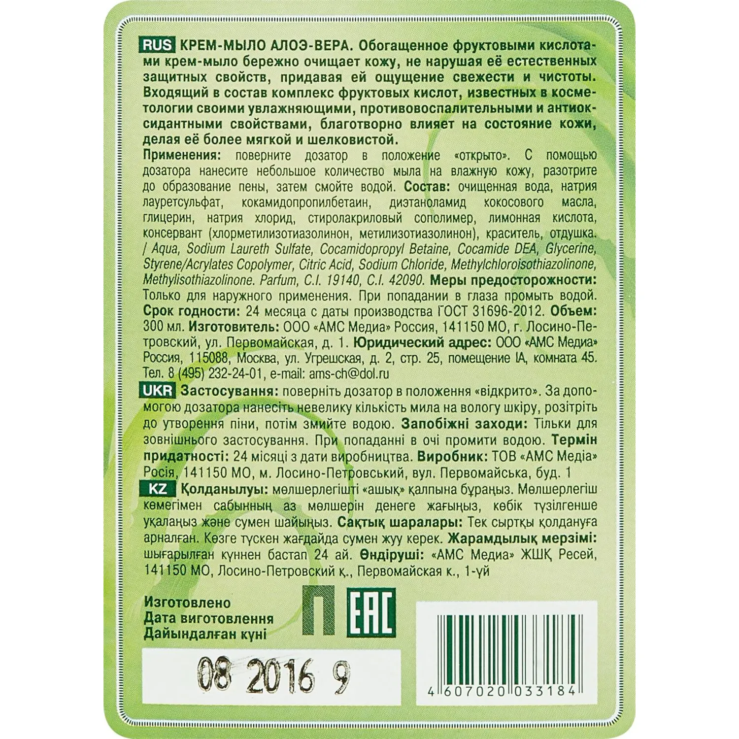 О товаре «Крем-мыло Русские травы Алоэ Вера 300 мл»