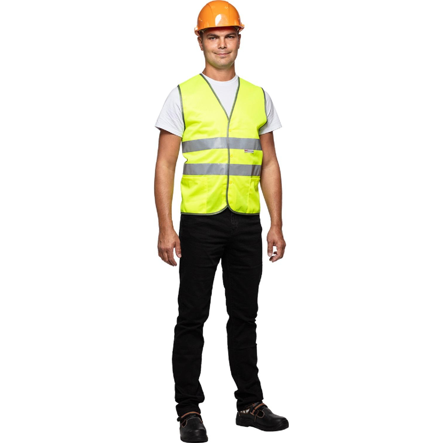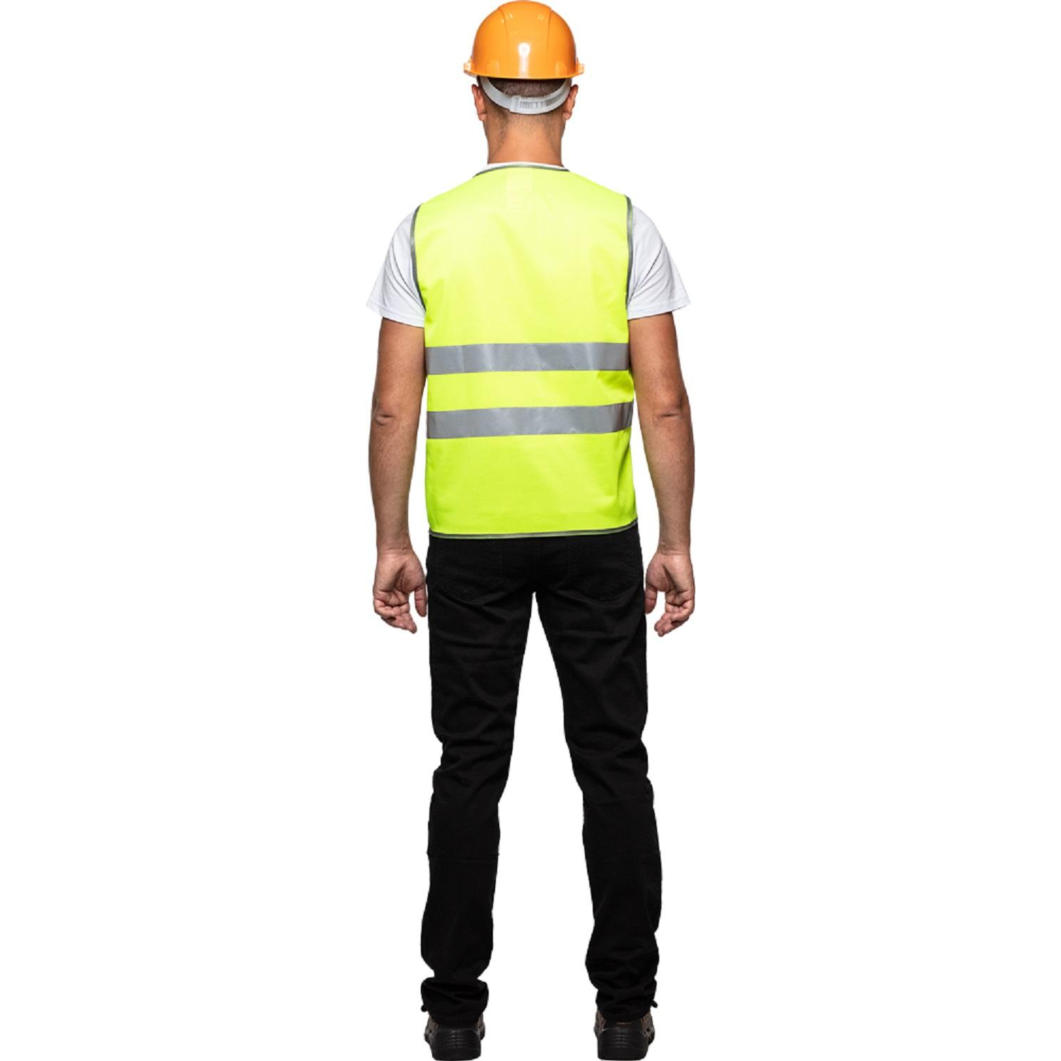 Изделие изготовлено из 100% полиэфира плотностью 120 г/кв.м и соответствует второму классу защиты. Ширина светоотражающей ленты — 50 мм. Дополнительно к типовому размеру применяется надбавка на свободу облегания, для использования с верхней одеждой.