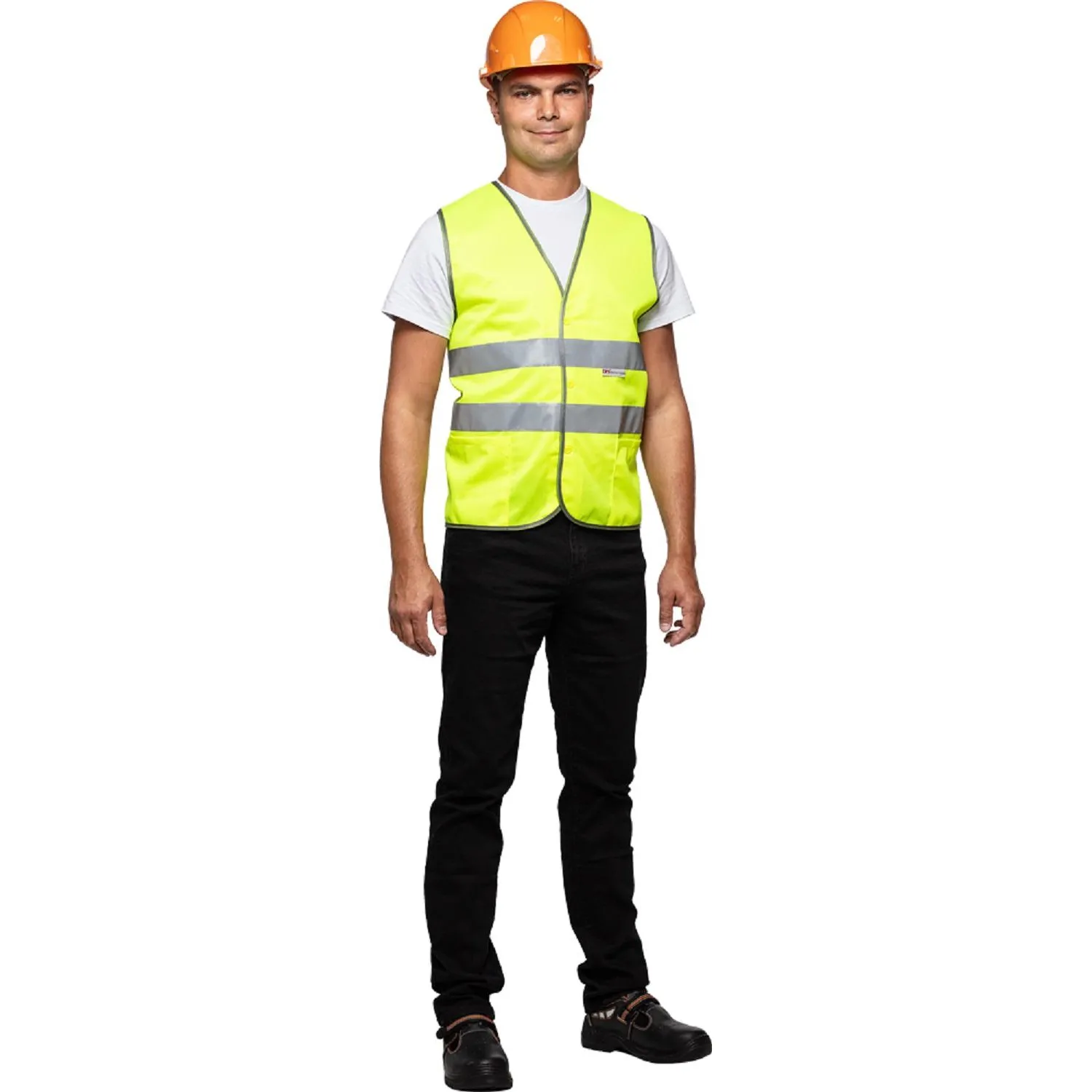 Жилет сигнальный Тип 2Т лимонный с СОП размер L (48-50). Сигнальный жилет незаменим при проведении ремонтно-строительных работ на проезжей части, железной дороге и в других опасных зонах. Рекомендован для использования работниками коммунальных служб, водителями автомобилей, пешеходами и велосипедистами. Сочетание неонового лимонного цвета и светоотражающих полос обеспечивает его заметность как днем, так и в темное время суток. Жилет с двумя накладными карманами и центральной застежкой на пуговицы надевается поверх другой одежды.