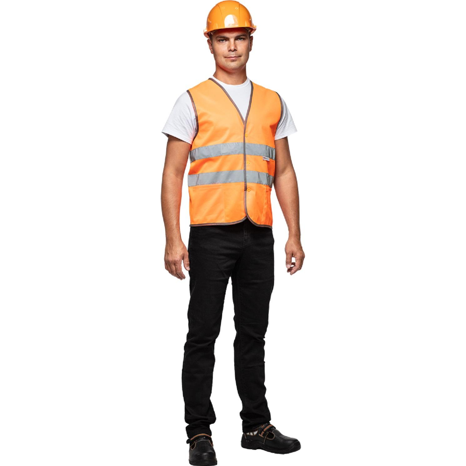 Жилет сигнальный Тип 2Т оранжевый с СОП размер XL (52-54). Сигнальный жилет незаменим при проведении ремонтно-строительных работ на проезжей части, железной дороге и в других опасных зонах. Рекомендован для использования работниками коммунальных служб, водителями автомобилей, пешеходами и велосипедистами. Сочетание неонового оранжевого цвета и светоотражающих полос обеспечивает его заметность как днем, так и в темное время суток. Жилет с двумя накладными карманами и центральной застежкой на пуговицы надевается поверх другой одежды.