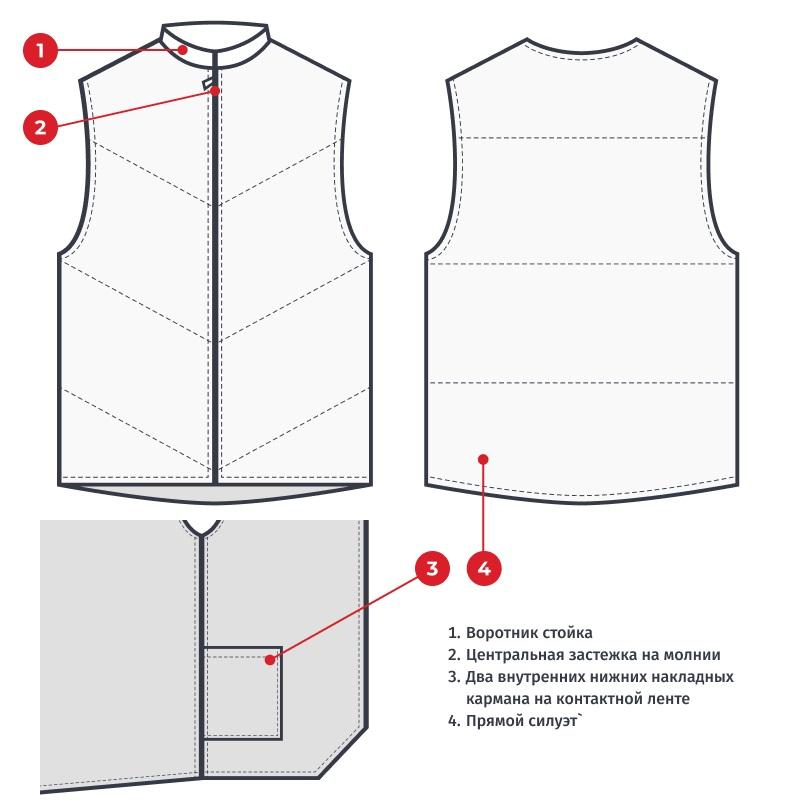 Изделие имеет прямой удлинённый крой и застёгивается на молнию. Жилет укомплектован двумя внутренними накладными карманами с клапанами на контактной ленте и воротником-стойкой. Модель без рукавов.