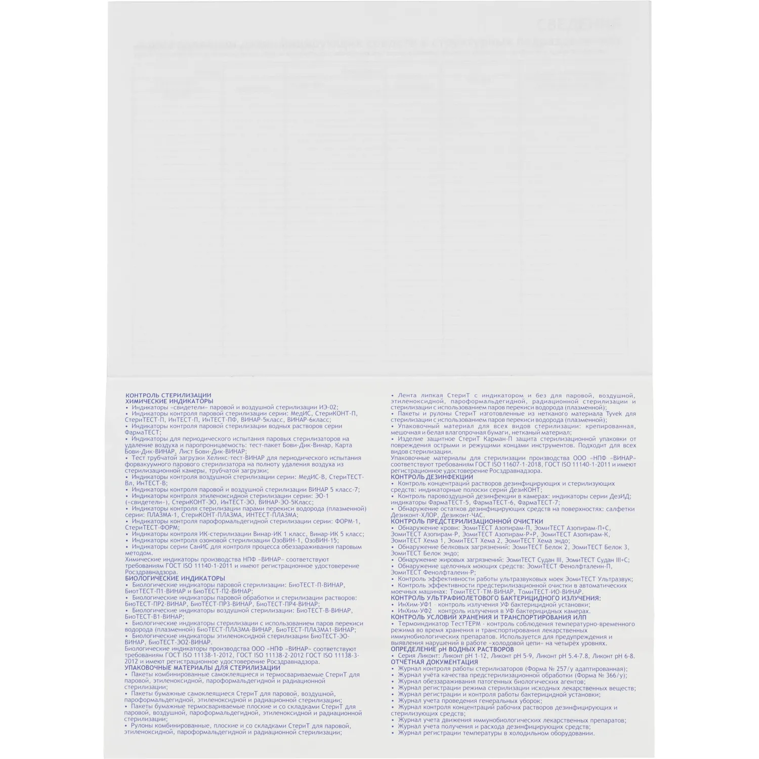 Журнал учёта получения и контроля дезинфицирующих средств для проведения дезинфицирующих мероприятий на объектах Винар предназначен для регистрации результатов замеров концентраций рабочих растворов дезинфицирующих и стерилизующих средств. Он помогает оценивать корректность приготовления растворов, выявлять нарушения условий хранения и обеспечивать эффективность дезинфекционных мероприятий. Журнал используется вместе с экспресс-полосками «Дезиконт», которые позволяют определить концентрацию действующих веществ за 3 минуты и могут быть наклеены непосредственно на страницу благодаря липкому слою.