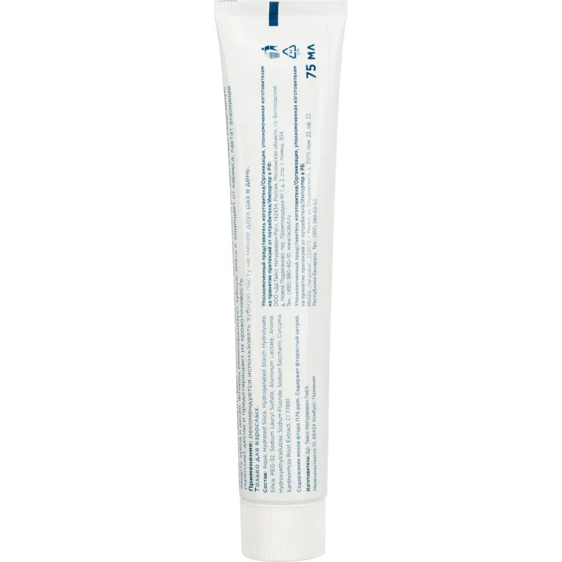 Состав: Aqua, Hydrated Silica, Hydrogenated Starch Hydrolysate, Silica, PEG — 32, Sodium Lauryl Sulfate, Aluminum Lactate, Aroma, Hydroxyethylcellulose, Sodium Fluoride, Sodium Saccharin, Curcuma Xanthorrhiza Root Extract, Cl 77891.